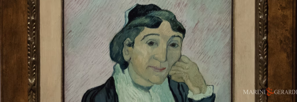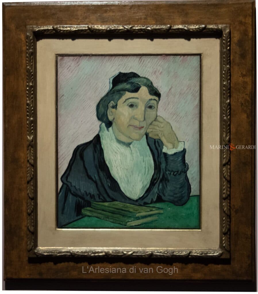 Marie Ginoux è ritratta con il costume tradizionale della Provenza, il suo sguardo è triste, ma dolce. I libri sul tavolo, “La capanna dello zio Tom” e i “Racconti di Natale”, ci parlano dei valori che Van Gogh le attribuiva: empatia, comprensione, gentilezza.