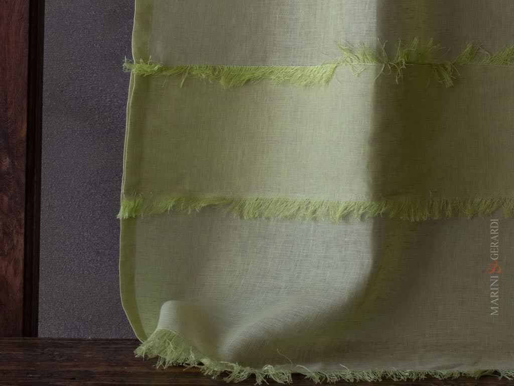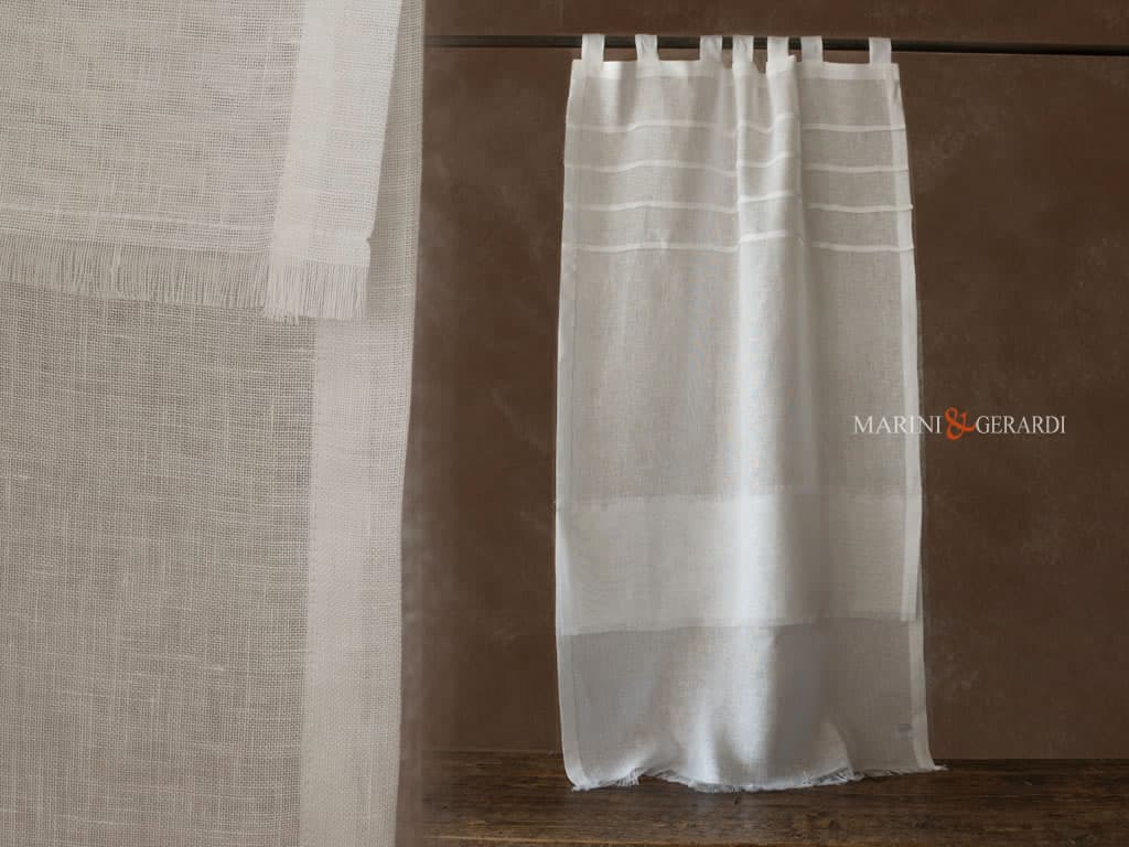 Tende moderne a vetro realizzate con tessuto in puro lino impreziosita da plissettature e sfrangiature. Il tessuto e i colori proposti rendono bello, piacevole ed elegantemente unico il risultato finale.
