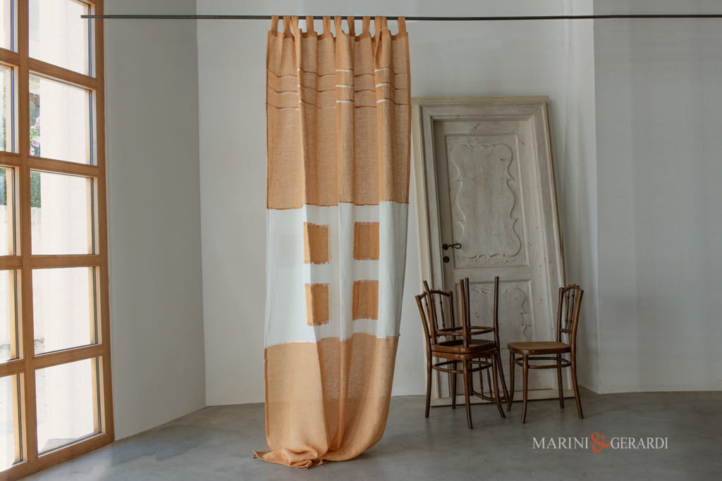 Tenda realizzata con tessuto in puro lino tinto in filo, di primissima qualità a trama fitta dalle trasparenze delicate.