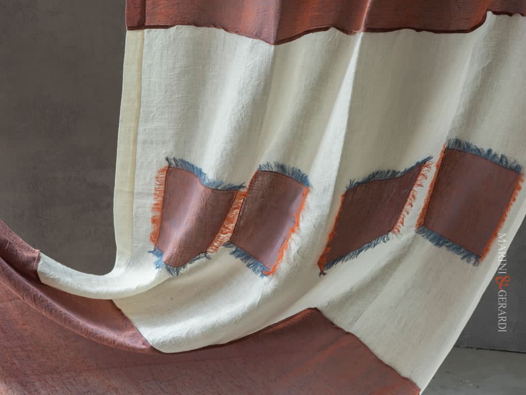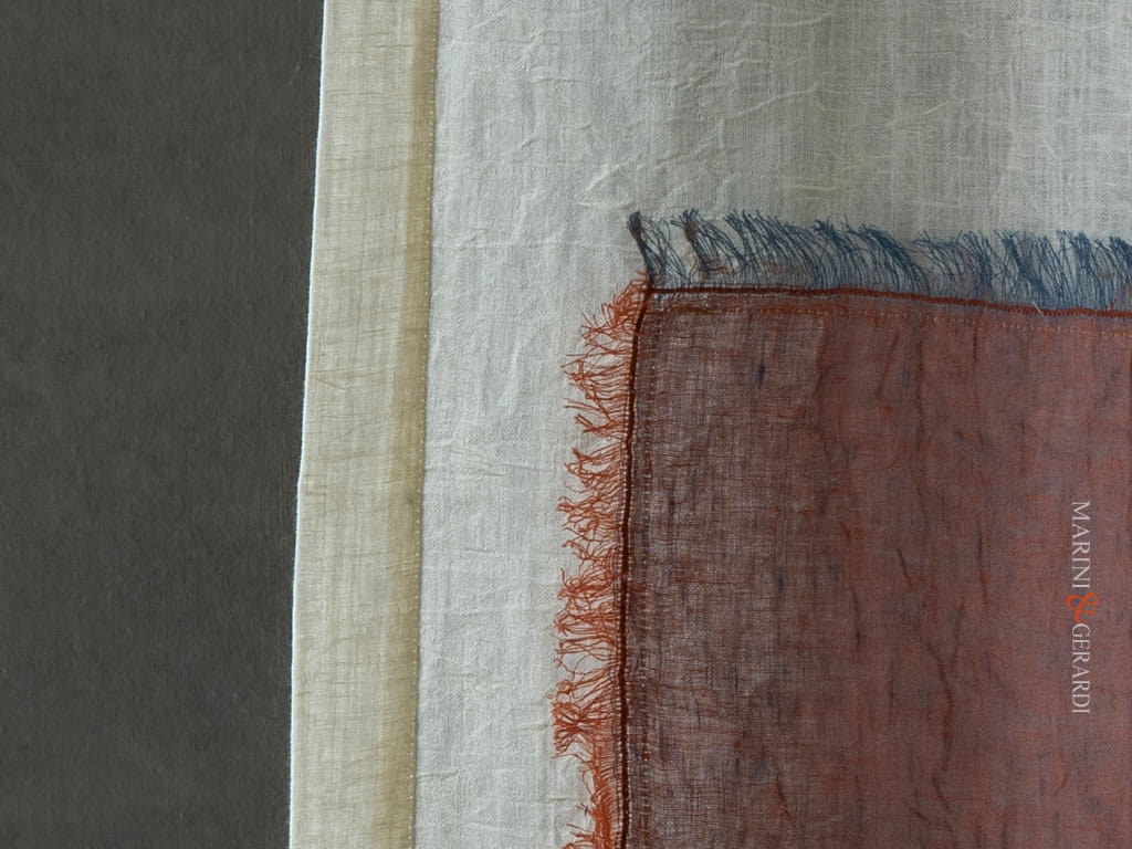 La tenda Antenore conquista al primo sguardo: il suo doppio colore a contrasto non è solo un dettaglio decorativo, ma un vero e proprio statement di stile. Il fondo in beige chiaro, tenue e avvolgente, fa da base ideale alle applicazioni in lino sfilacciato, proposte in tonalità vibranti che catturano lo sguardo e definiscono lo spazio.