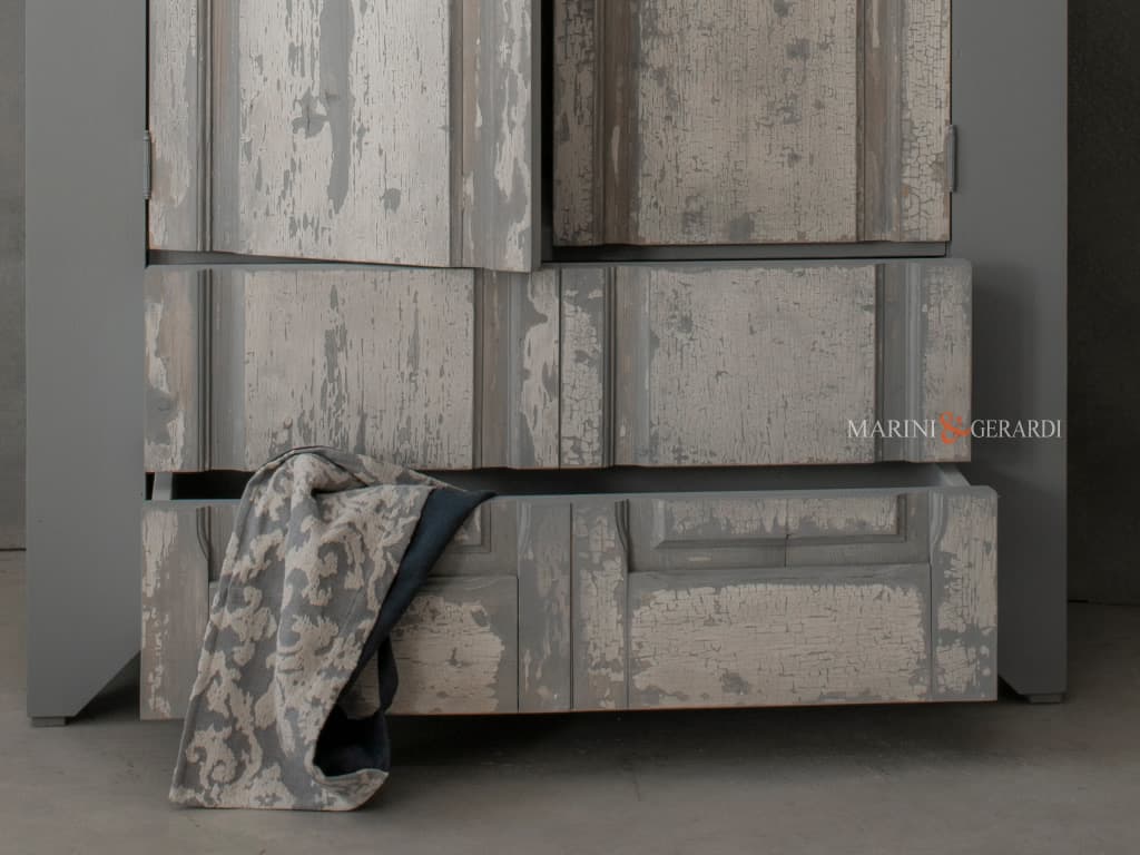 La struttura esterna del guardaroba è realizzata in legno massello, un materiale robusto e duraturo che conferisce al mobile un aspetto solido e raffinato. Le ante a battente sono decapate con colori pastello per creare un effetto di invecchiamento e rendere il mobile ancora più originale ed esclusivo.