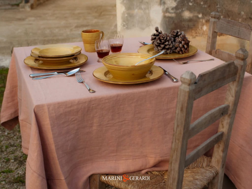 Una Tovaglia in lino moderna e tradizionalista, romantica e trasgressiva, gioiosa e malinconica dalle tinte pastello, che può essere utilizzata in tutte le occasioni! In una parola: indimenticabile.