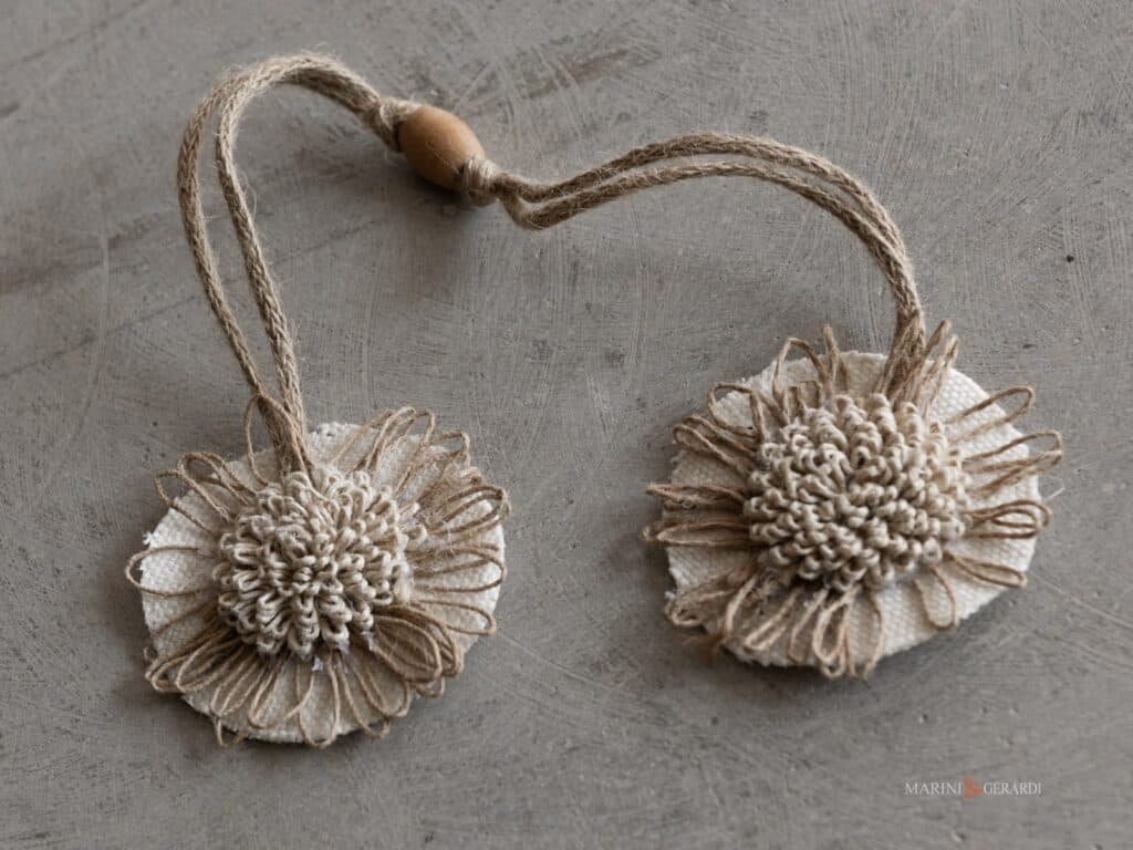 Calamita Fermatenda in corda #64 – Embrasse con fiori e accessori realizzati a mano. Ogni pezzo unico è costituito da 2 fiori singoli con magnete – lunghezza lacciolo cm.25 circa