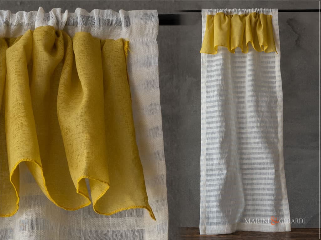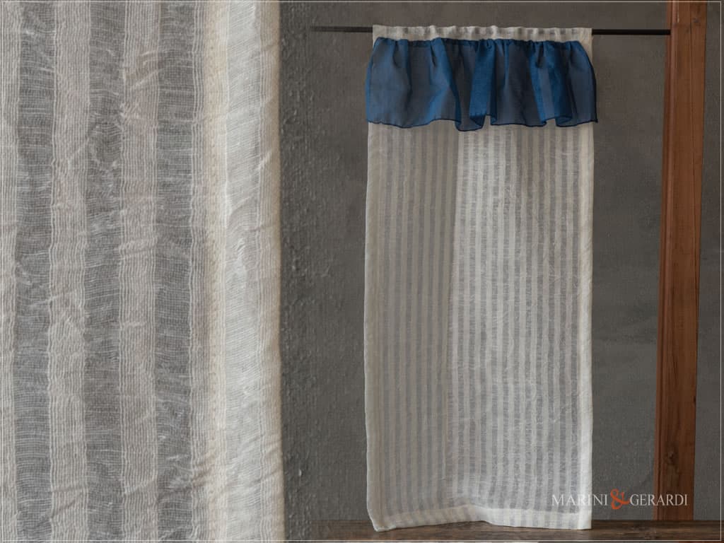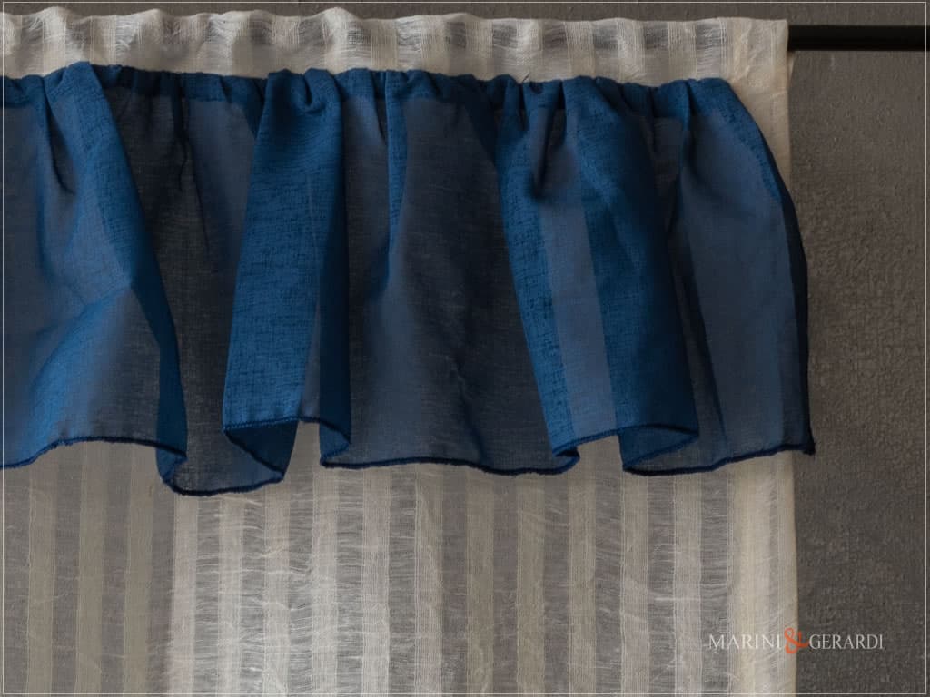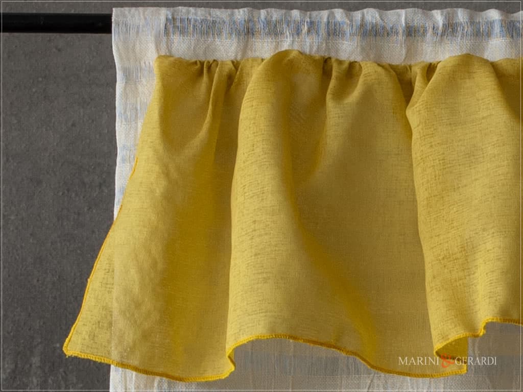 Tenda a vetro realizzata con tessuto in puro lino garzato impreziosita da una mantovana con velo in organza a trama trasparente e delicata. I tessuti utilizzati rendono bello, piacevole ed elegantemente unico il risultato finale.