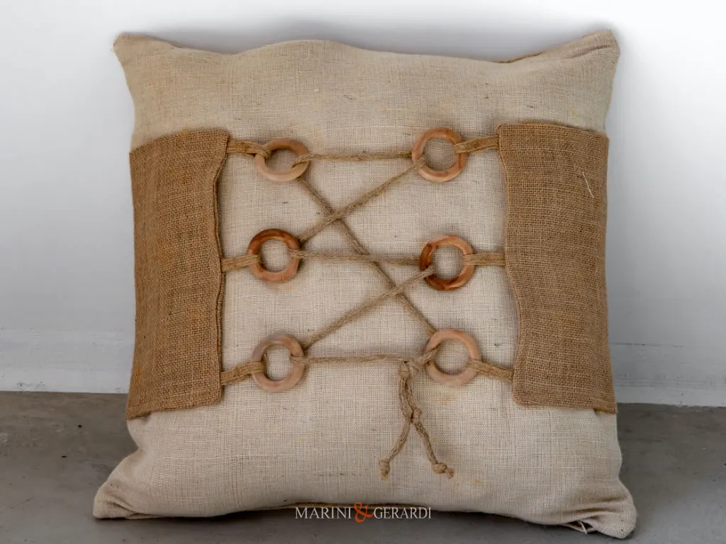 SAVANA – Cuscini Decorativi Arredo Casa in Juta e Cotone applicazioni in corda e anelli in legno 45 x 45 – Produttore e Design Esclusivo Marini & Gerardi