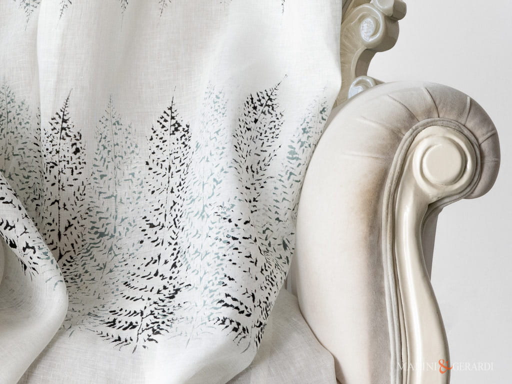 La verticalità degli alberi disegnati su AURA ha un potere psicologico: slancia le altezze e apre i confini della stanza. La doppia nuance di colori si fonde con la trama del lino e permette alla luce di penetrare in modo netto, e che rappresenta il suo punto di forza.