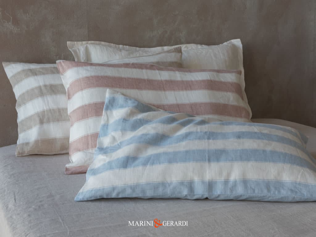Federe Cuscini Letto a Righe Maxi 100% lino tinto in filo con colori INDANTRENE. Un Tessuto che accetta frequenti lavaggi, particolarmente stabile alla luce come il sole, agli agenti atmosferici. La nostra biancheria casa: è sinonimo di Comfort, Lusso, ma anche di una certa Informalità e praticità.