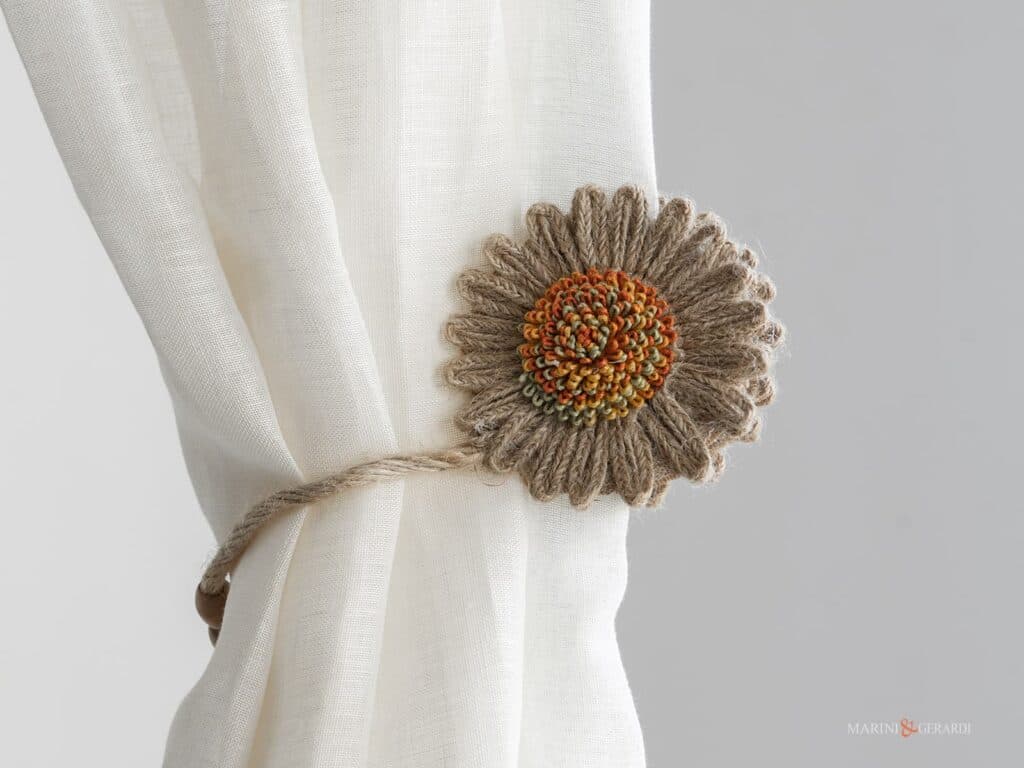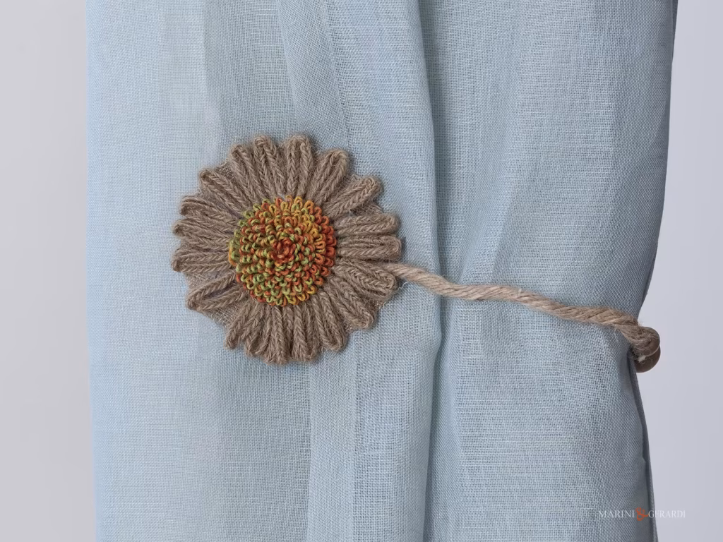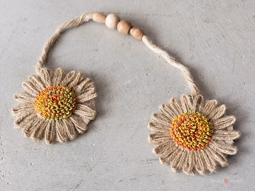 Fermatenda con Calamita la Bellezza della Corda incontra la Praticità #64 – Embrasse con fiori e accessori realizzati a mano. Ogni pezzo unico è costituito da 2 fiori singoli con magnete – lunghezza lacciolo cm.25 circa