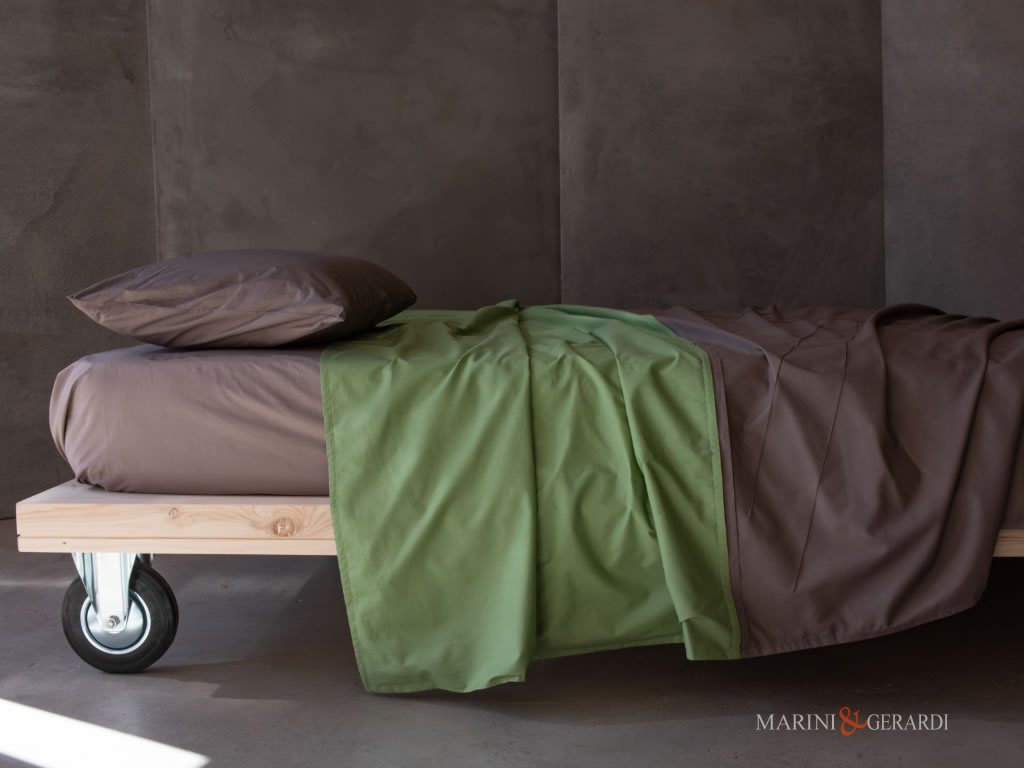 Questa offerta include uno lenzuolo piano sopra con inserto in doppio colore + un lenzuolo sotto Tinta Unita + federe cuscino in combinazione.