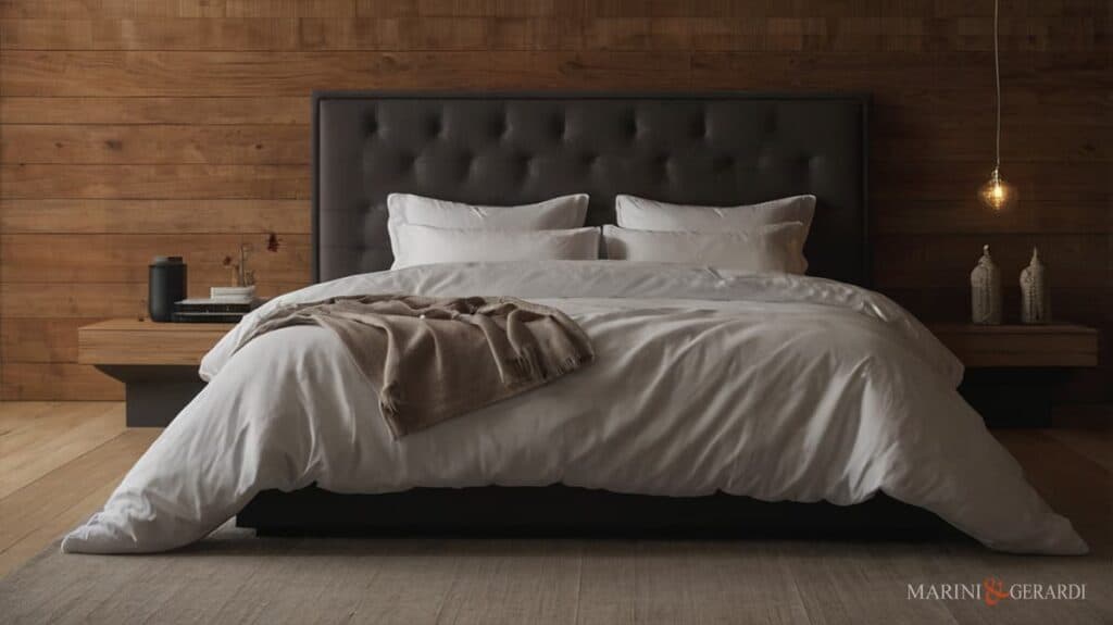 Letto Legno Moderno: robustezza del legno massello e raffinatezza dei tessuti per un riposo senza eguali.