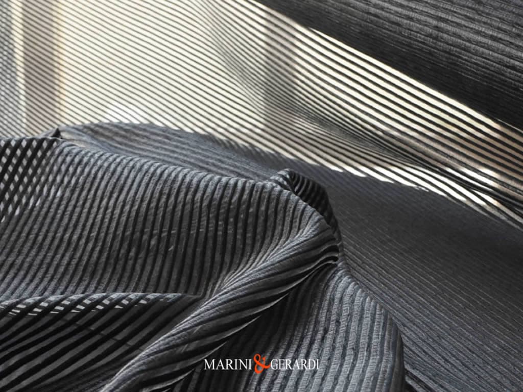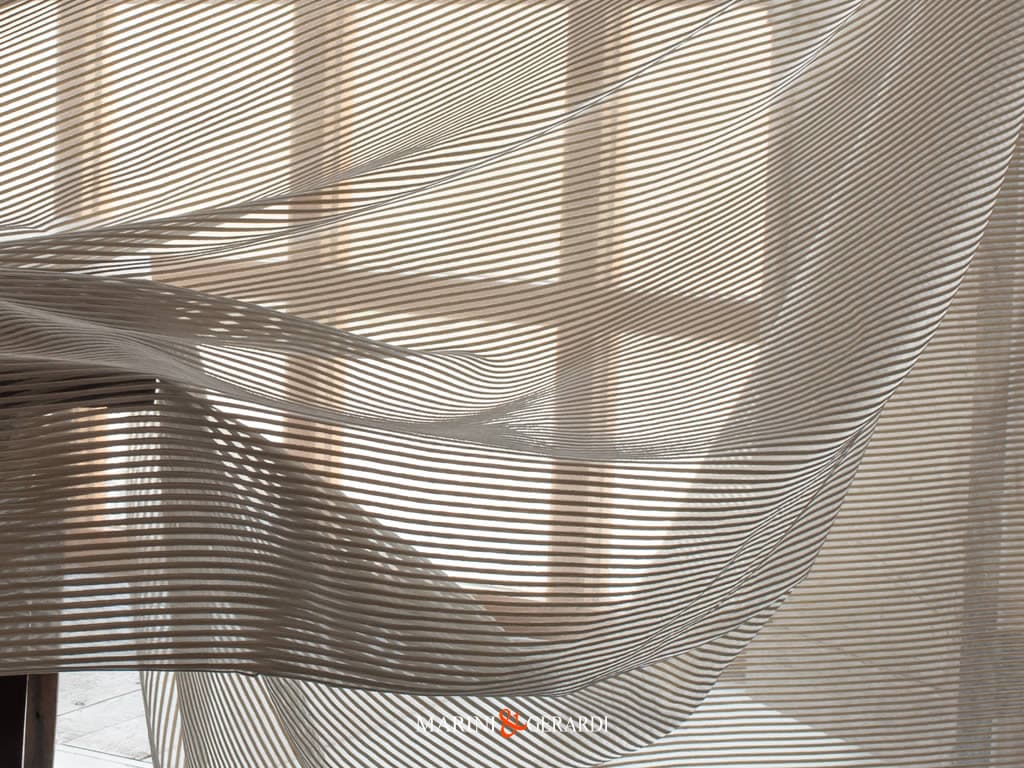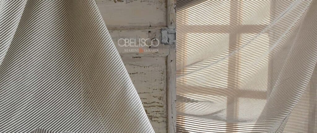 OBELISCO – Tessuto per tende moderne in Cotone di altissima qualità. Una organza a righe corposa,  piacevole al tatto, con inserti inglobati.