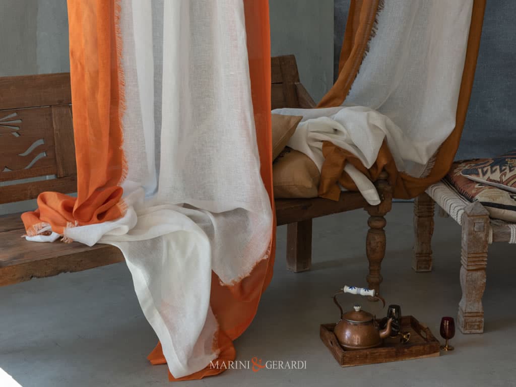 - Tessuto in lino con finissaggio morbido e delicato al tatto / tessuto semitrasparente e luminoso.