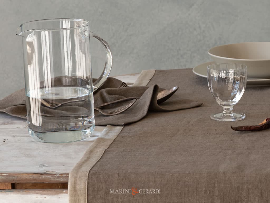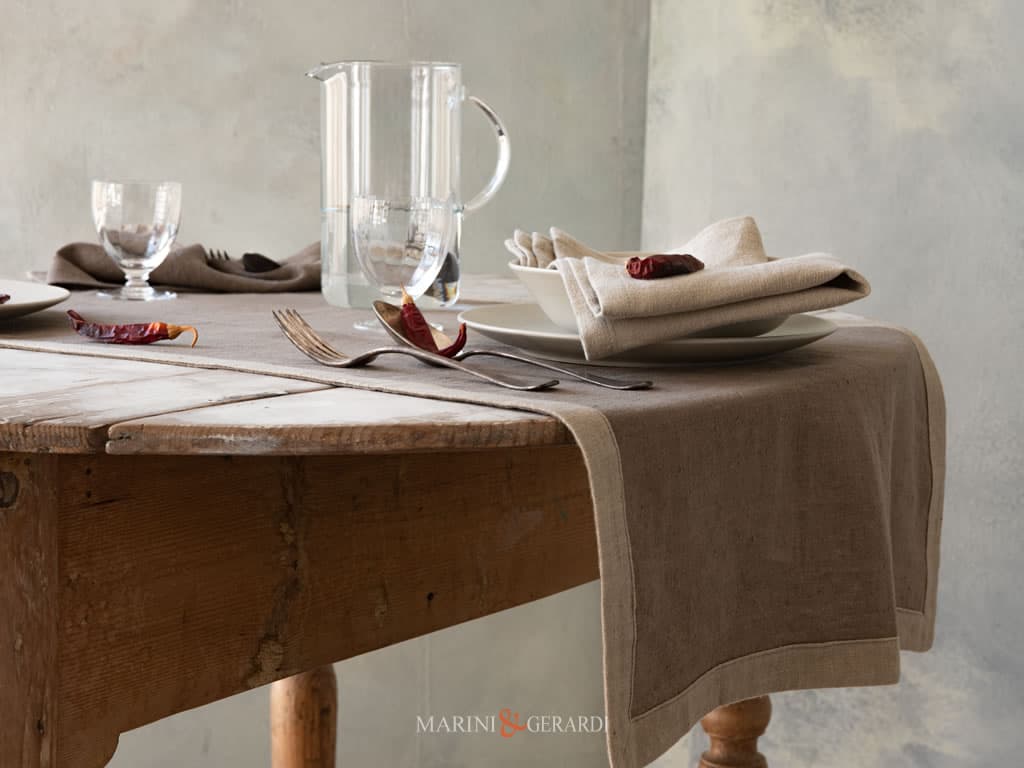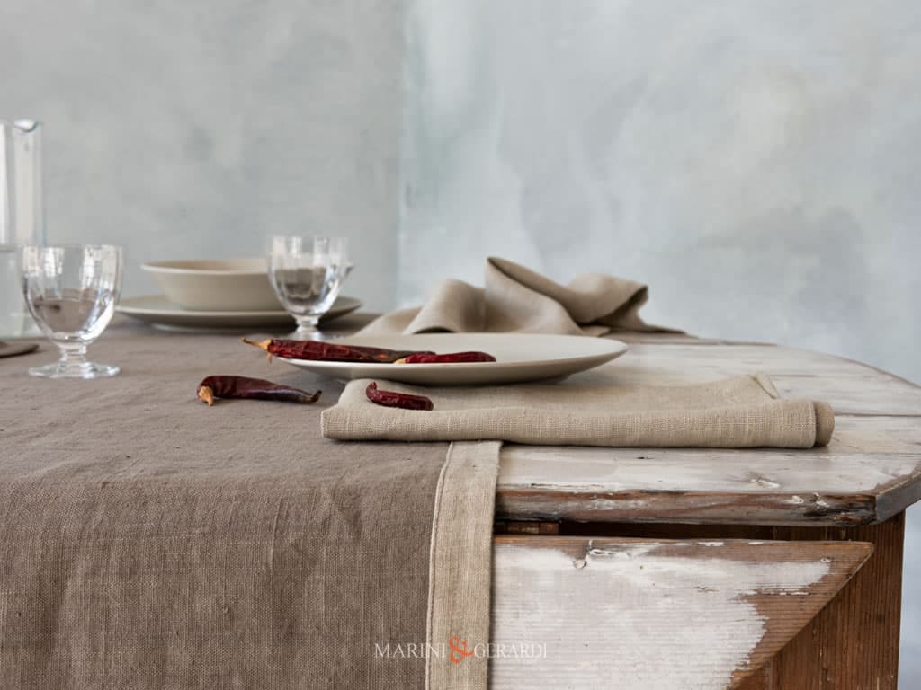 Un runner in lino Elegante, facile e pratico da utilizzare, un tocco finale importante a tavola per un pranzo o una cena perfetta con una delle deliziose combinazioni di colore disponibili. I prodotti sono stati realizzati artigianalmente nel nostro laboratorio. Made in Salento.