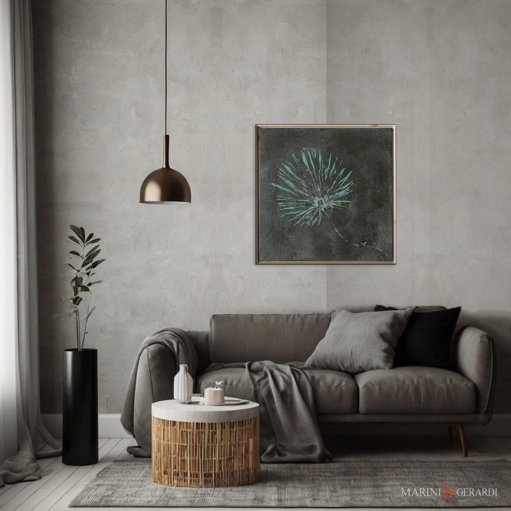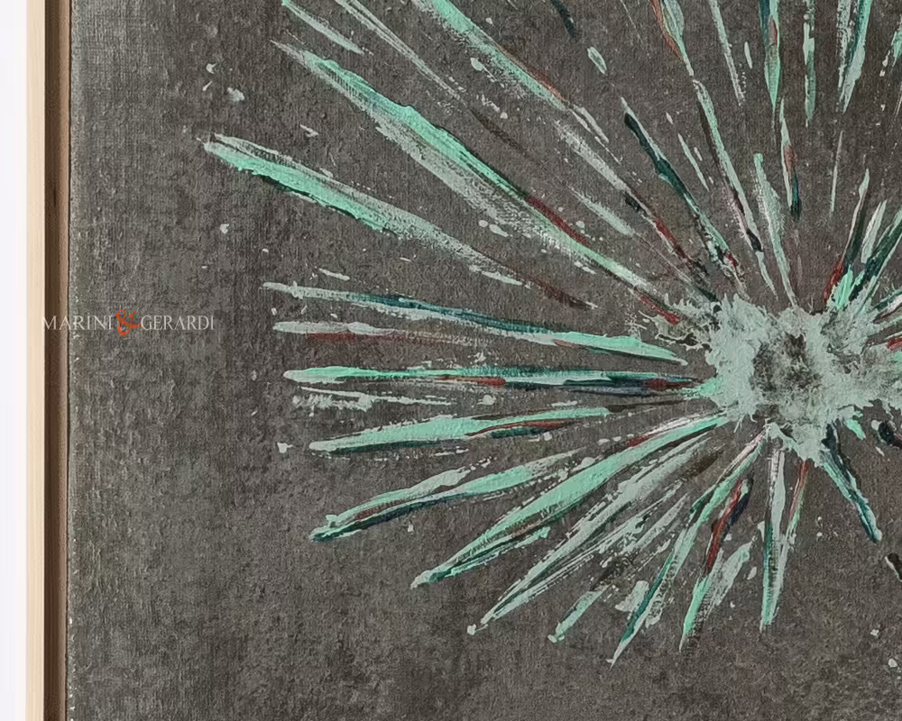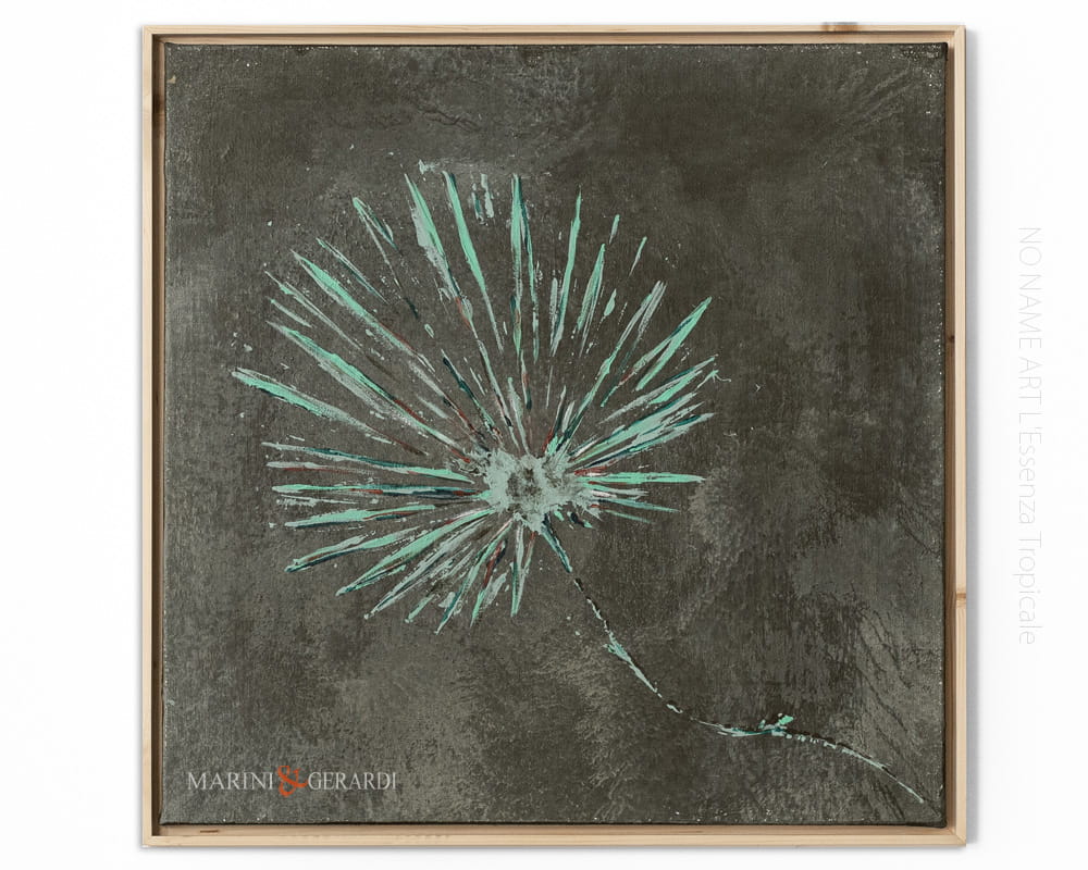 Al centro di questo universo astratto, la foglia di Washingtonia si erge come un sigillo. Stilizzata, è dipinta in un verde oltremare che agisce come un faro cromatico. Il contrasto è netto: la precisione verticale della foglia si oppone al disordine organizzato della base, creando quell’effetto di sorpresa ricercato nei quadri particolari moderni.
