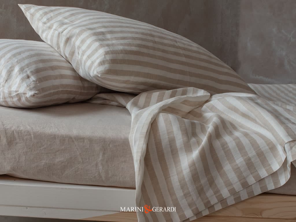 Questa offerta include un lenzuolo sotto Tinta Unita + uno lenzuolo sopra a righe e federe cuscino. Per altre misure o combinazioni colore contattate: assistenza@marinigerardi.it