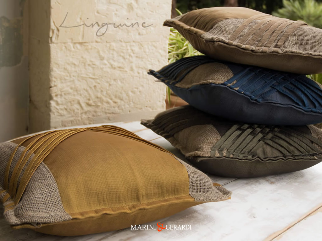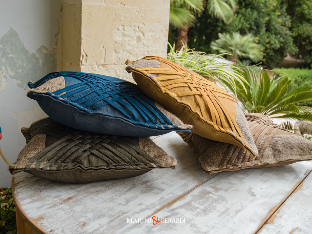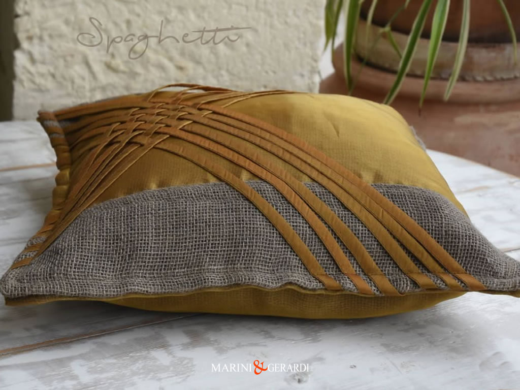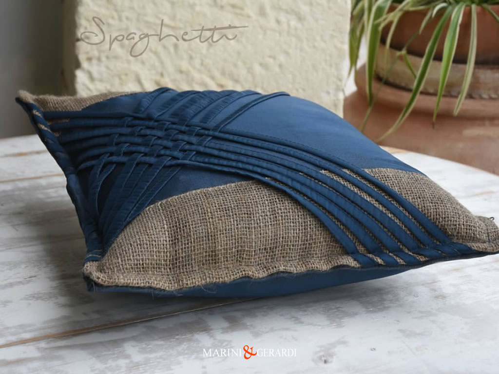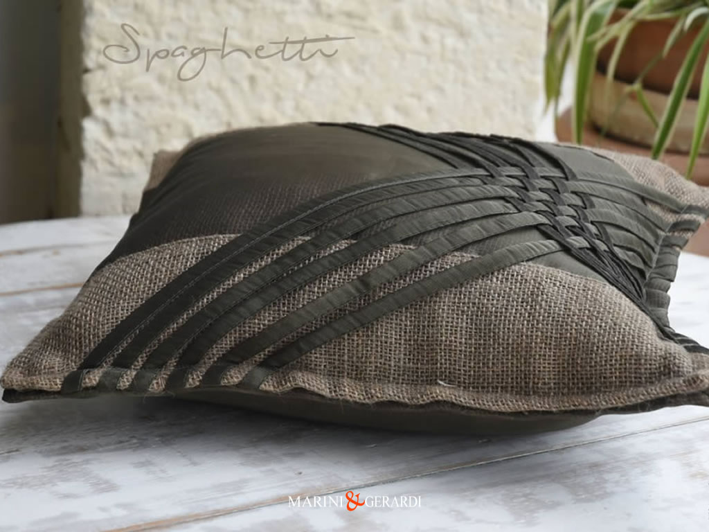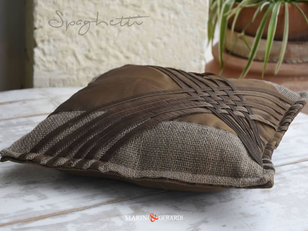 “SPAGHETTI”- Cuscini Arredo Tessuto in Juta a trama larga con inserimento di Organza a colore.