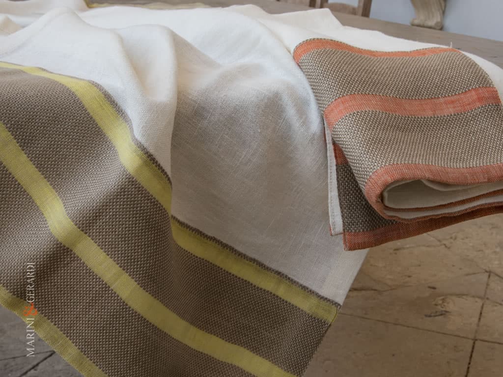 Tessuto Puro Lino a righe orizzontali. I colori, accuratamente scelti da noi, conferiscono a questo prodotto un fascino unico e inconfondibile.