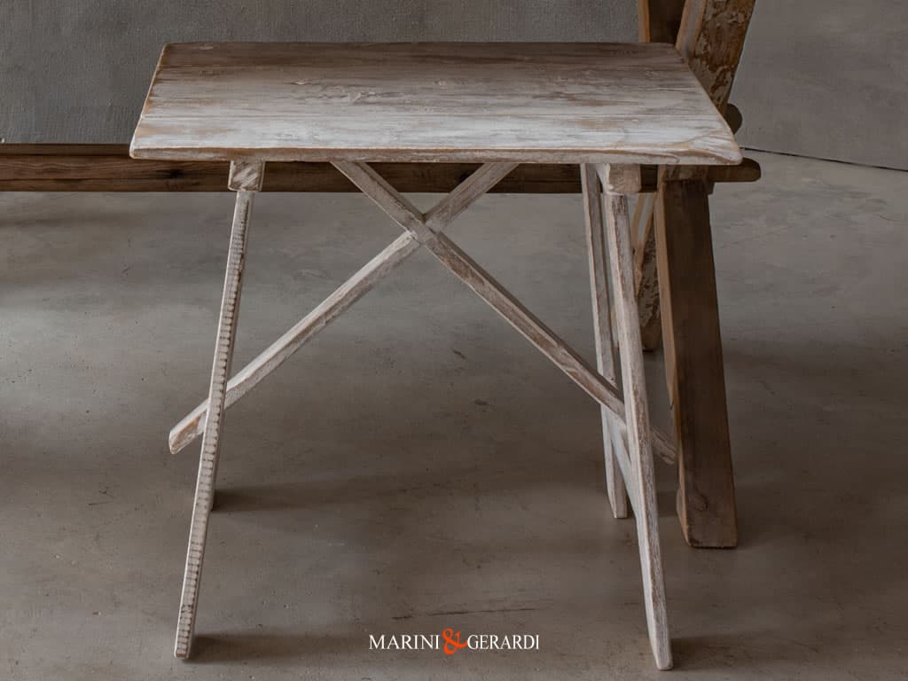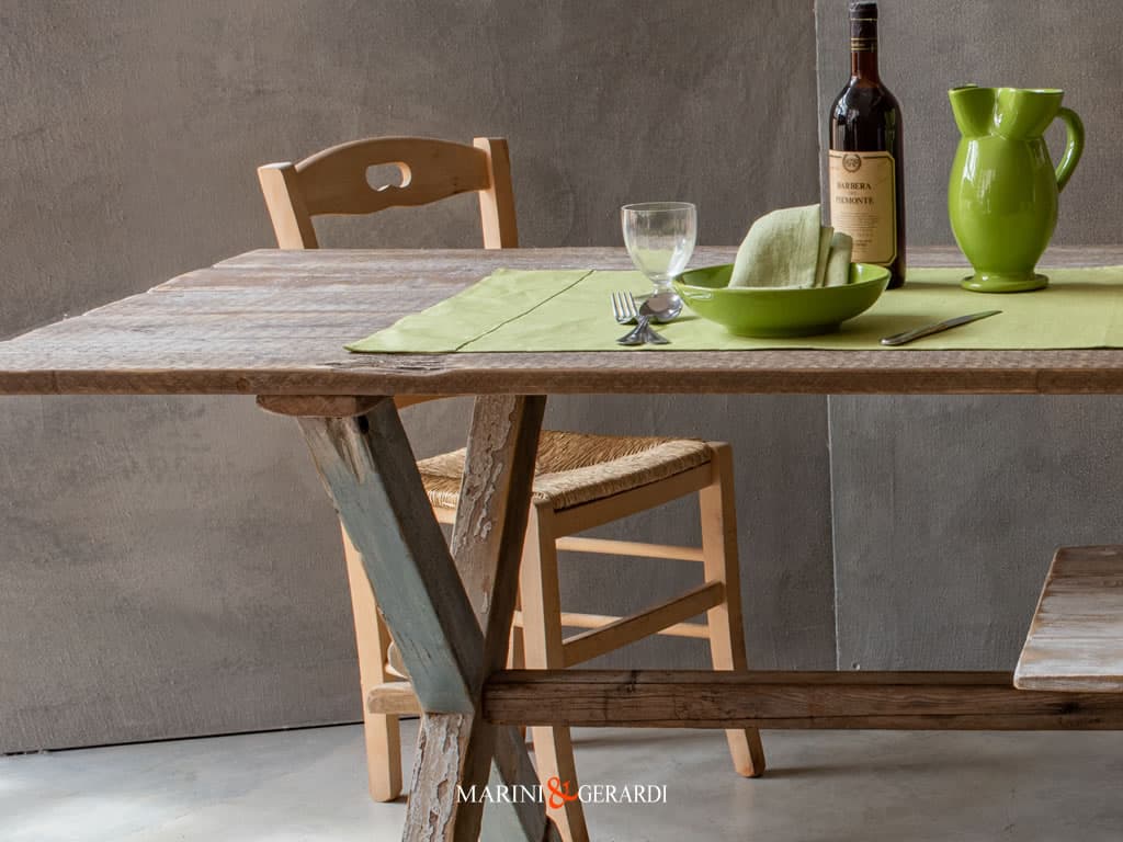 Struttura Tavolo: legno massello rigorosamente invecchiato e da recupero costruito artigianalmente in bottega ad incastro, gambe incrociate altezza da terra 78 cm circa.