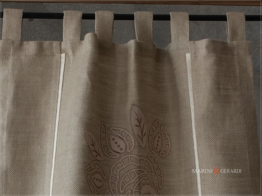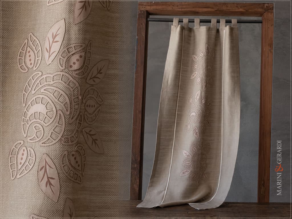Tende a vetro di ricamate realizzate con tessuto in puro lino in combinazione con ricamo realizzato artigianalmente in esclusiva; inoltre la trama del tessuto rendono bello, piacevole ed elegantemente unico il risultato finale.