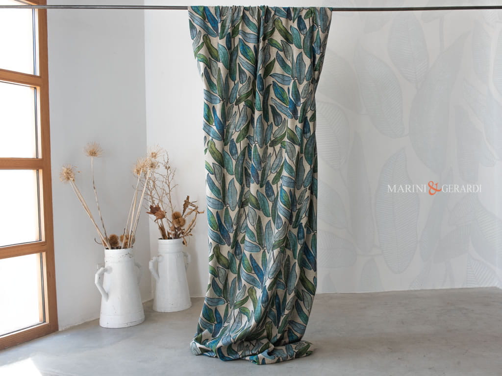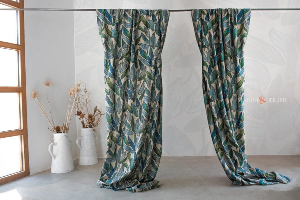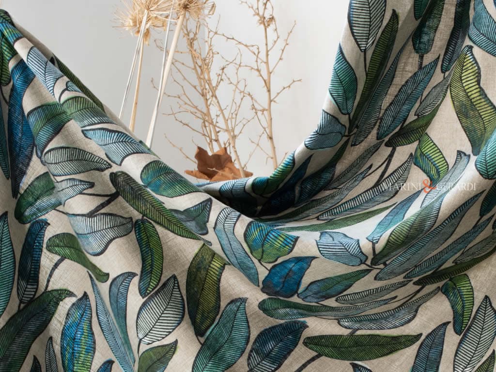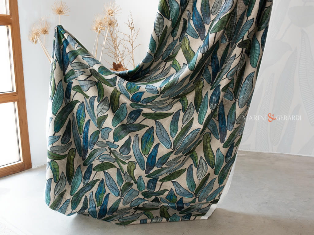Tende in Lino a Foglie Tropicali: Il lino è un materiale versatile e atemporalmente elegante per le tende della camera da letto. Il nostro modello a foglie tropicali è una scelta straordinaria, in grado di abbinarsi senza sforzo al resto dell’arredamento della tua zona notte. Questo tessuto offre non solo bellezza visiva, ma anche una sensazione di freschezza e leggerezza, creando l’atmosfera perfetta per un luogo di relax.