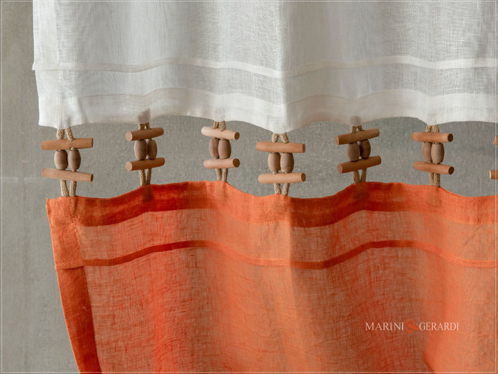 Tende da Cucina a Vetro realizzate con tessuto in puro lino impreziosita da plissettature con inserti a colore + passamaneria in legno. Il tessuto utilizzato rende bello, piacevole ed elegantemente unico il risultato finale.