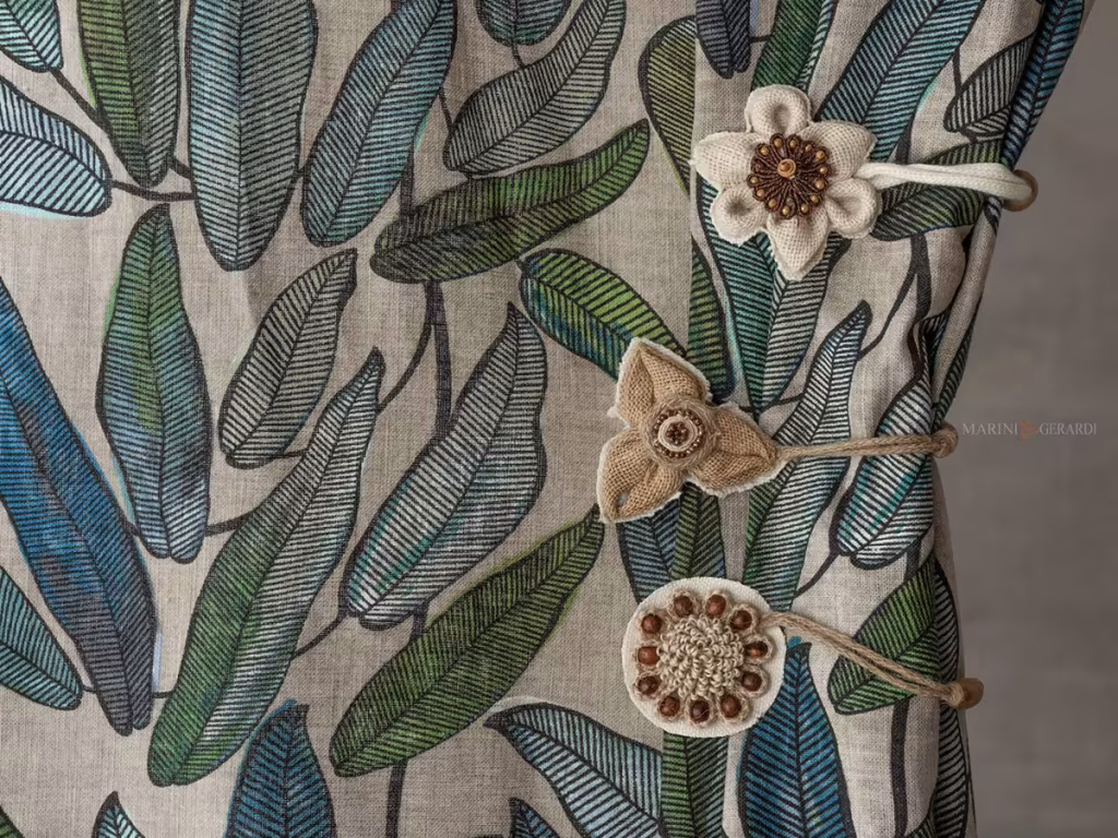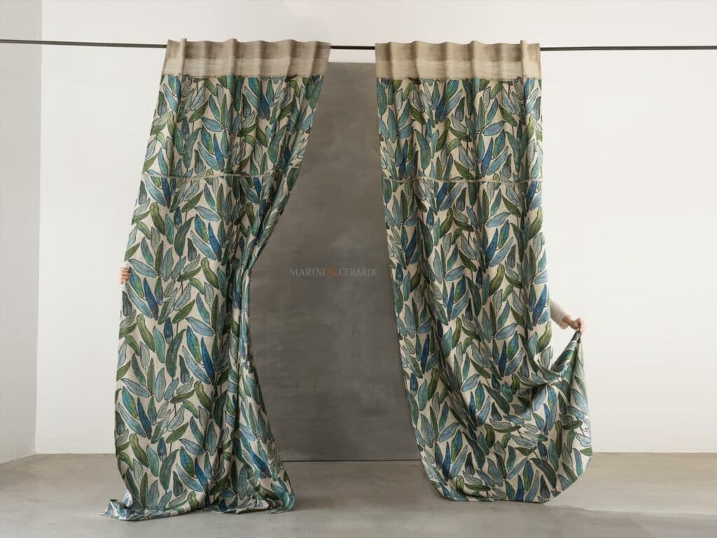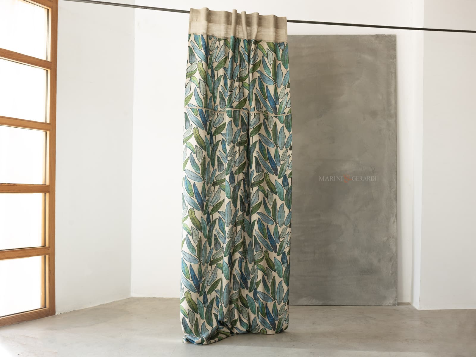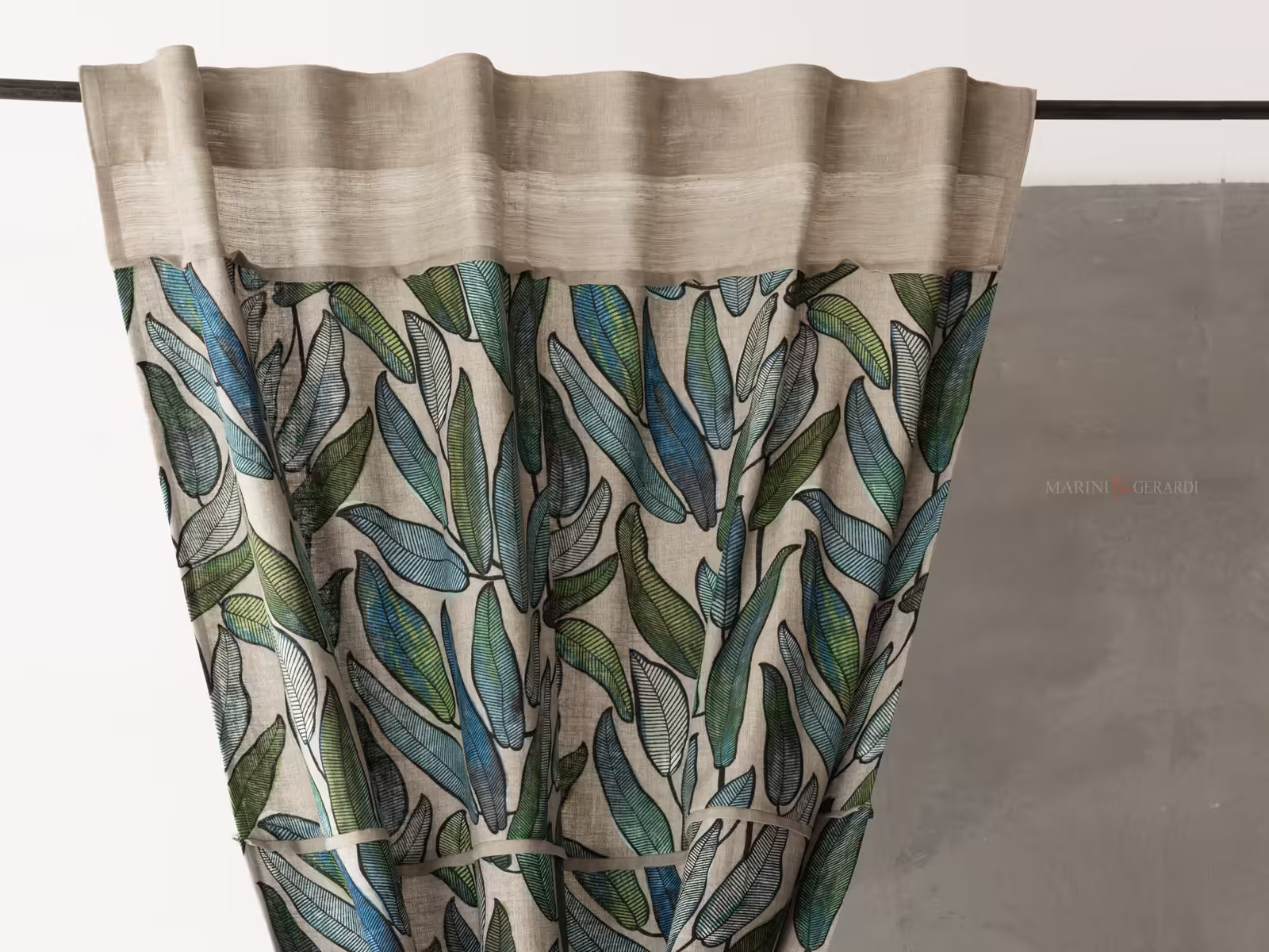 ALDEBARAN – Tende da interni moderni parzialmente oscuranti in lino: un intreccio di foglie e sfumature naturali per vestire il soggiorno con un’elega Fissaggio con asole a vista, anelli, asole a scomparsa o arricciatende. Realizzata su misura nel laboratorio sartoriale Marini & Gerardi — Made in Italy.