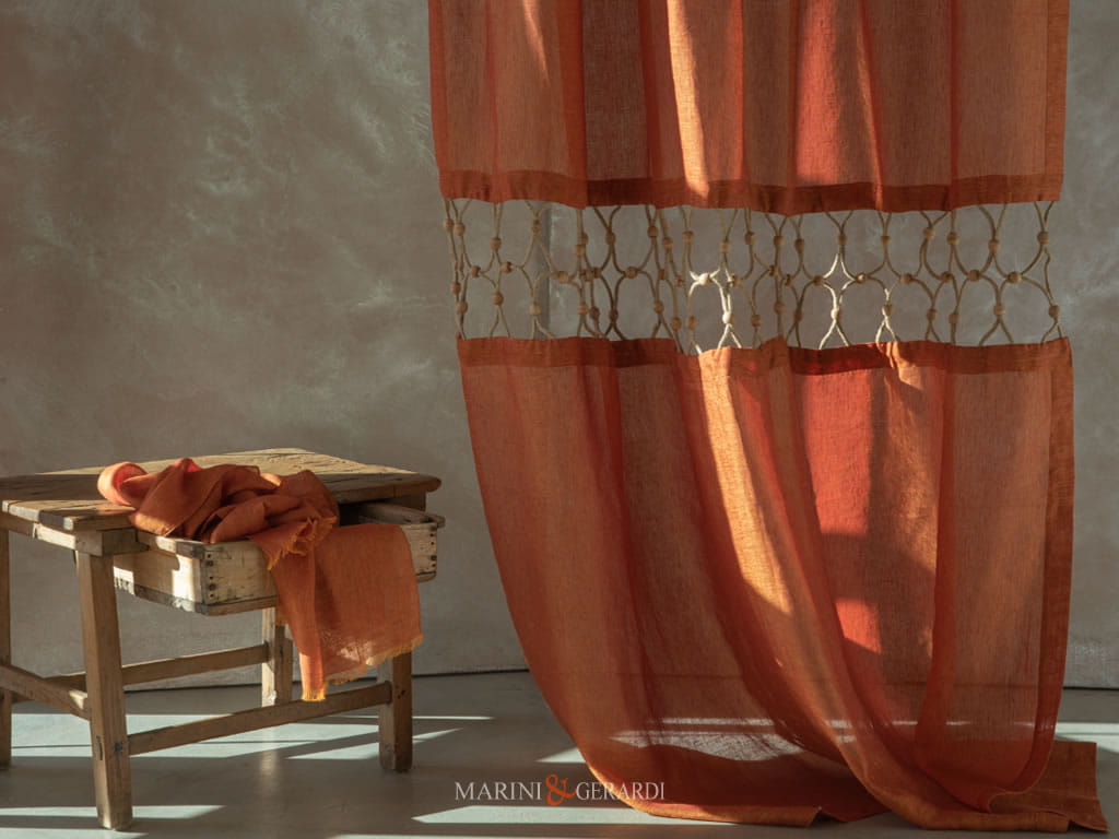 Tenda realizzata con tessuto in puro lino tinto in filo, di primissima qualità a trama fitta dalle trasparenze delicate.