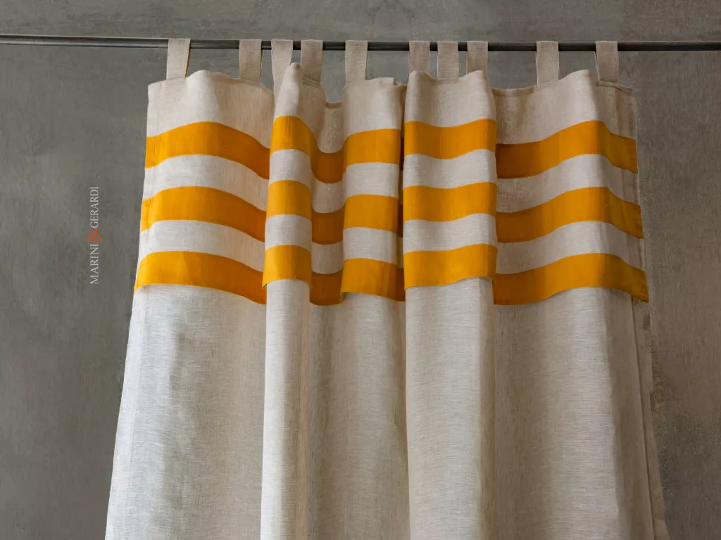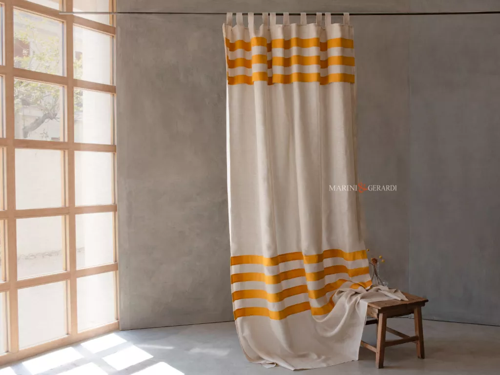 EGIZIANA lussuosa e straordinaria: tende per interni in lino italiano tinto in filo. Tenda con mantovana superiore 50 cm circa con applicazione di tre fasce in orizzontale, con colore a contrasto. Prodotto d’Alta Sartoria. Applicazioni in Pura Seta o Lino