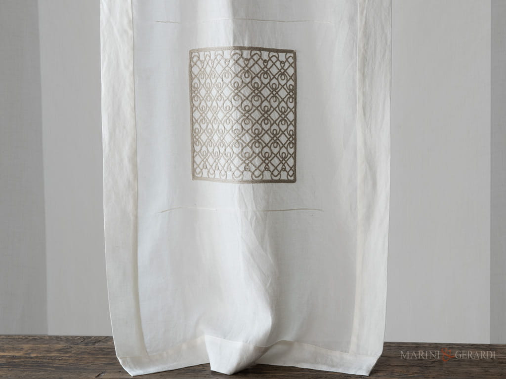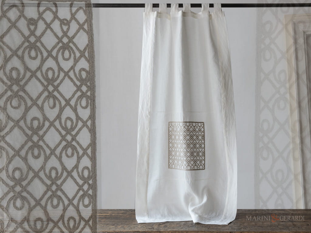ORFEO mini – Tendine di Lino Ricamate Moderne. Siamo Unici e Diversi nel Design! Realizzate in puro lino, per un look Classico di Tradizione ma si inseriscono splendidamente in un soggiorno Moderno o stanza da letto.