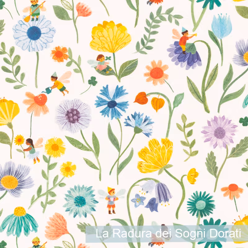 Entrate in un mondo magico, dove fate e folletti svolazzano tra i fiori, curando dolcemente i loro giardini segreti. Qui, tra petali dorati e foglie scintillanti, nasce La Radura dei Sogni Dorati, un disegno incantevole stampato su morbido cotone che avvolge la cameretta in un abbraccio di pura meraviglia.