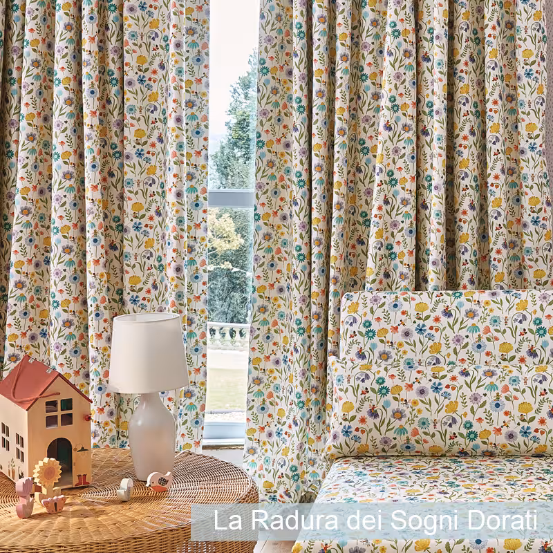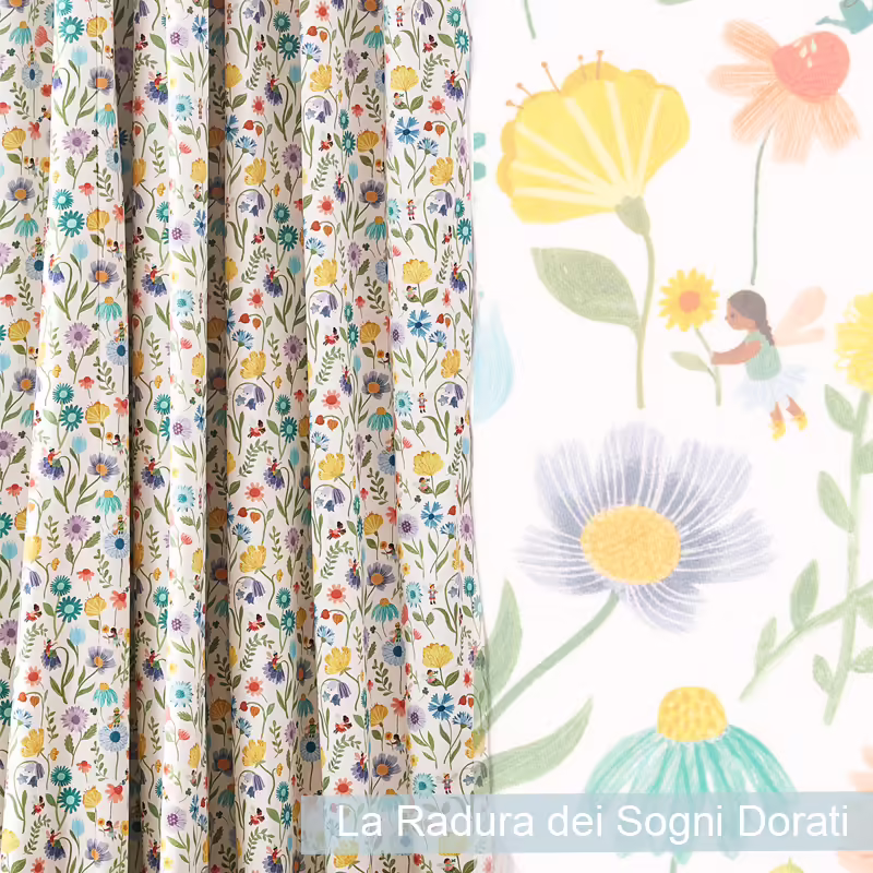 La Radura dei Sogni Dorati: Tessuti per tende per interni idee cameretta bimba – Un prato magico dove i sogni più belli prendono vita.