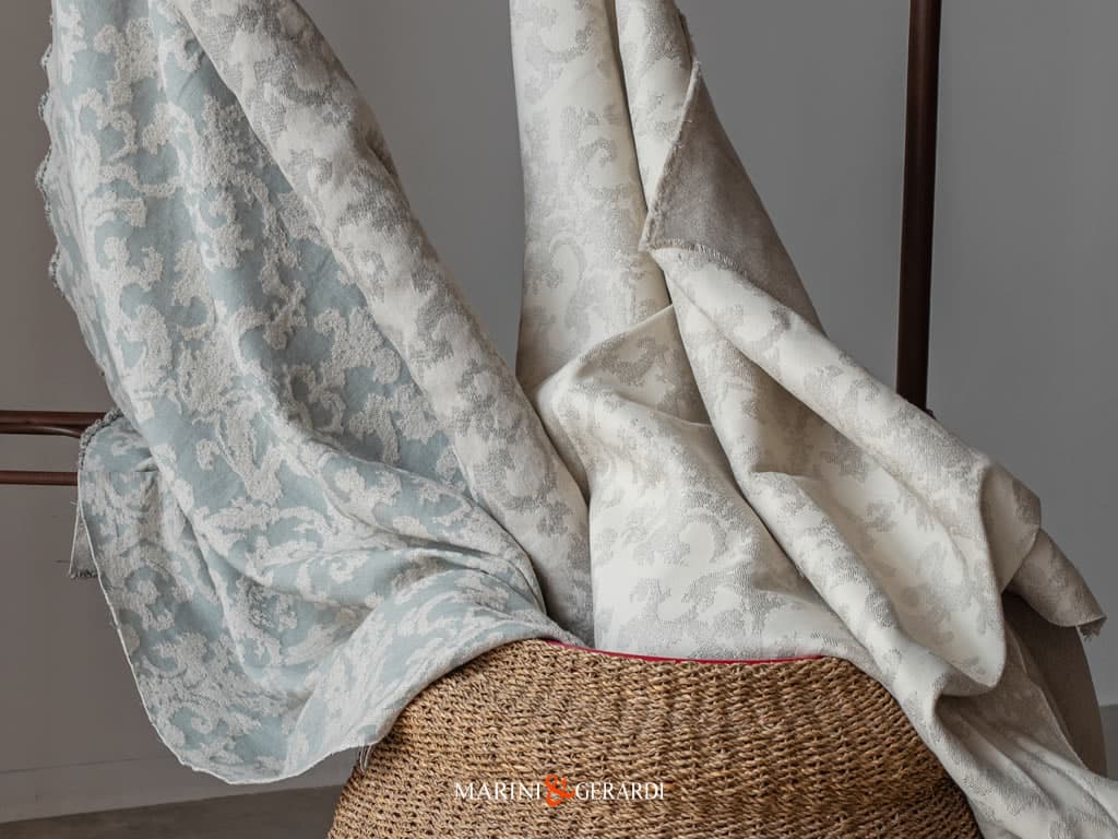 Il nostro 5 Stelle è un Misto Lino Jacquard Made in Italy un Tessuto pesante a trama fitta, mano morbida, con un motivo a volute Rococò dal tratto antico che lo rendono dolce e accattivante.