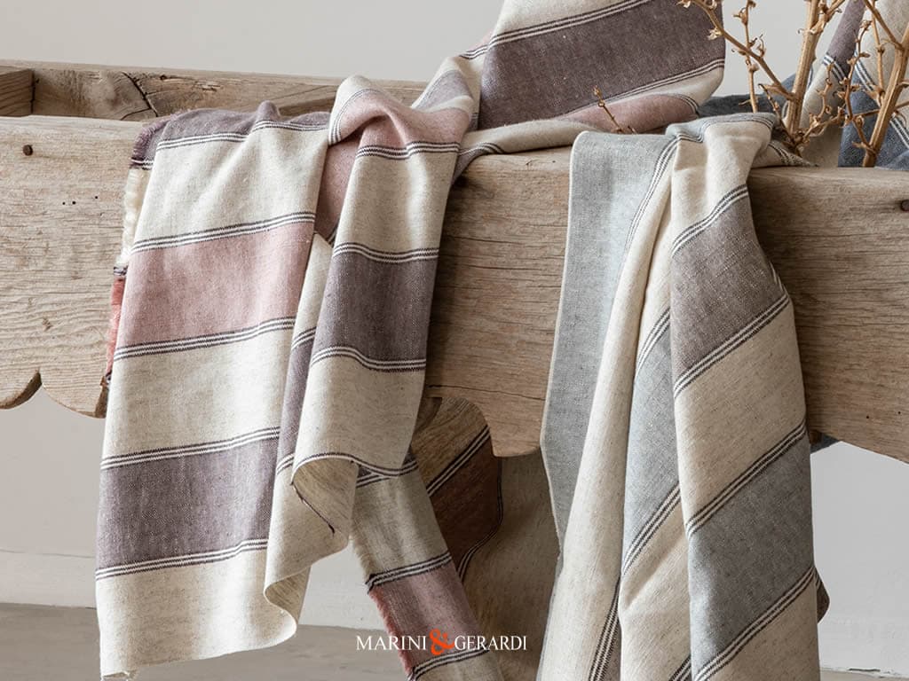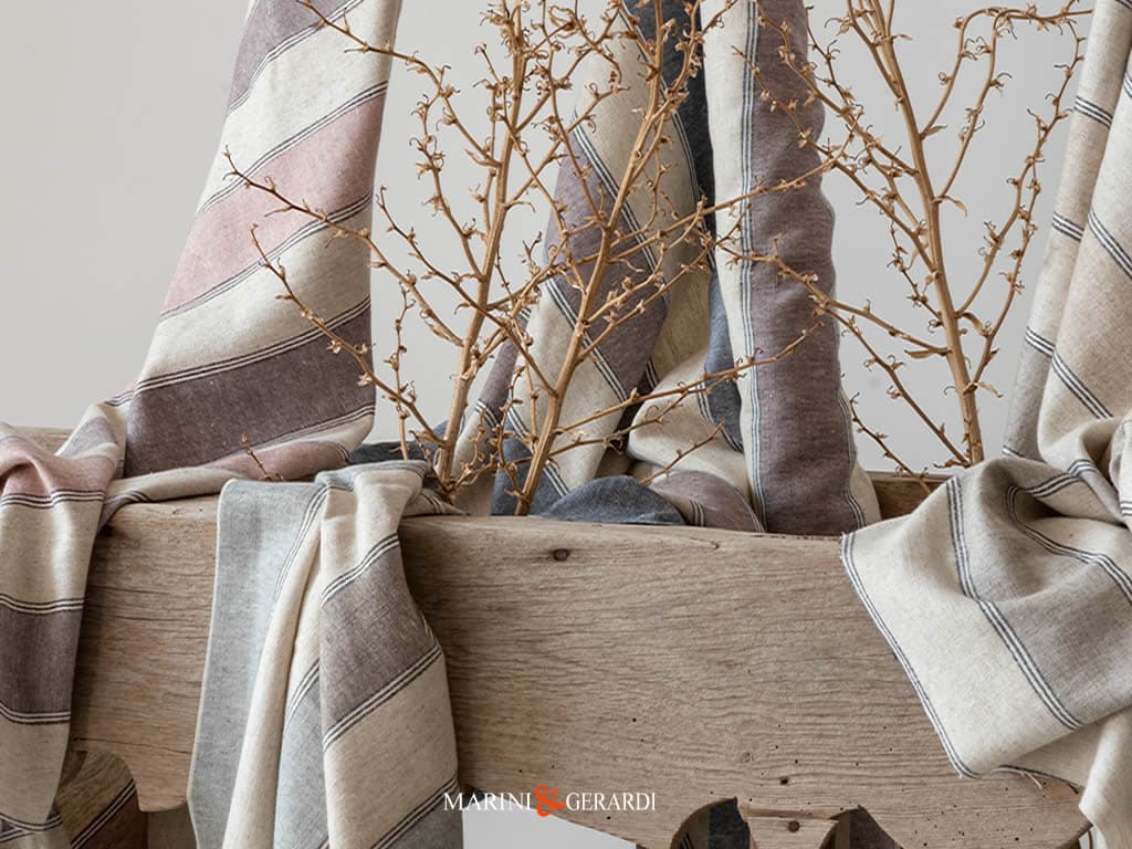 Il nostro BAMBU è un Misto Lino  Made in Italy un Tessuto pesante a trama fitta, mano morbida, con un motivo a righe dal tratto antico che lo rendono dolce e accattivante.