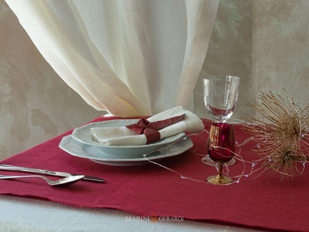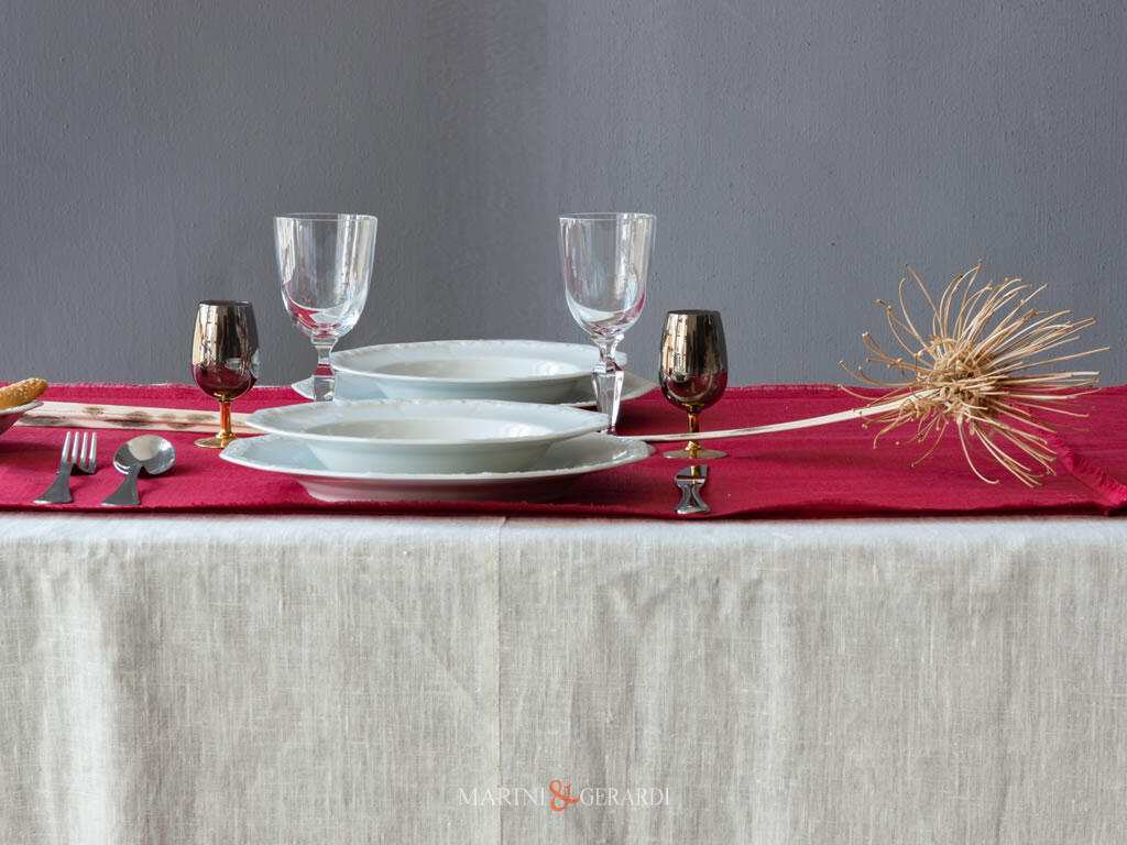Rinnoviamo la tavola con una tovaglia in Puro Lino in una unica tonalità di colore, con un bel runner rosso, una Tovaglia che sa essere Elegante quanto Informale, veramente Esclusiva per un regalo raffinato da fare o da ricevere