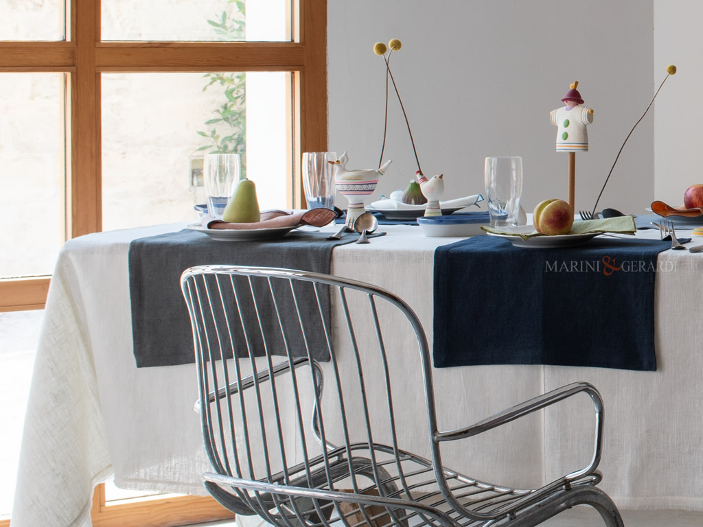 Tessuto in puro lino rusticale dal sapore vintage. Tessuto pesante con effetto corposo ma delicato al tatto. Unione con uno o più tagli trasversali. GIULIETTA & ROMEO Tovaglia in Lino bianco Panna Acida con Tovagliette Colazione colore a contrasto.