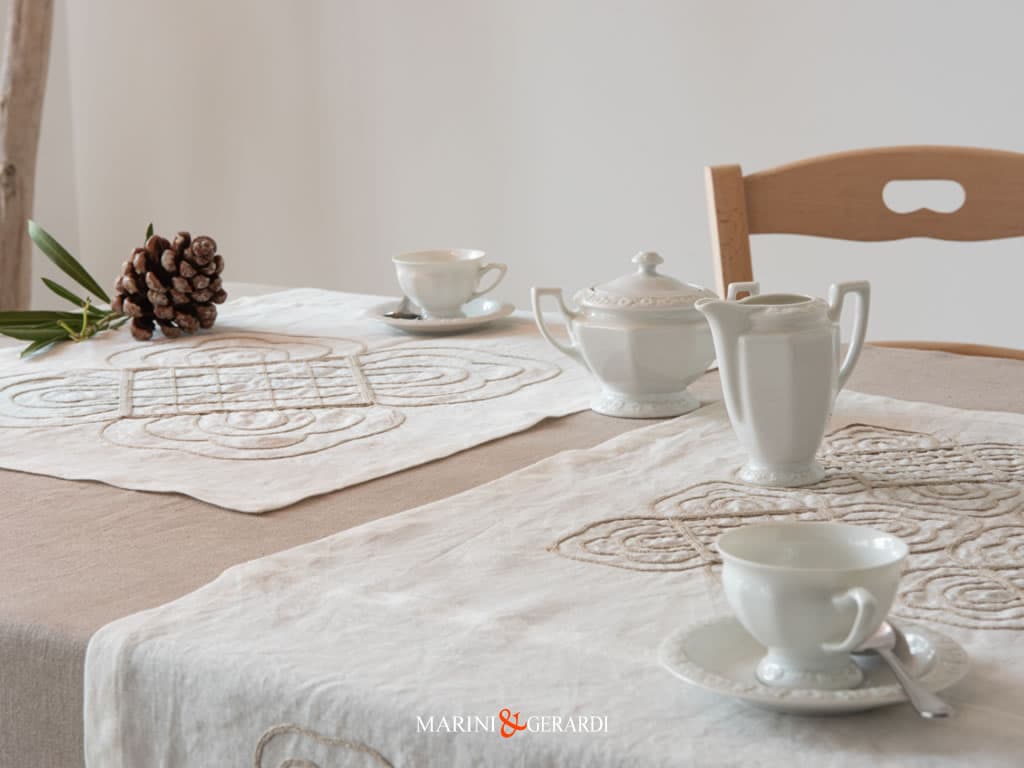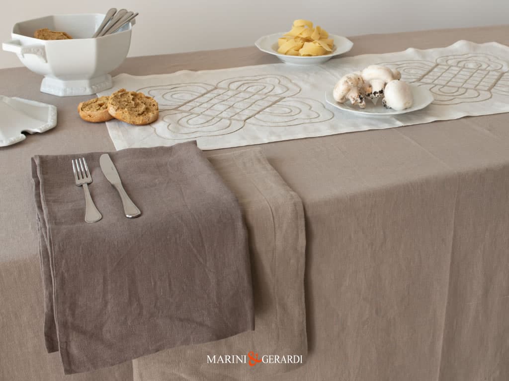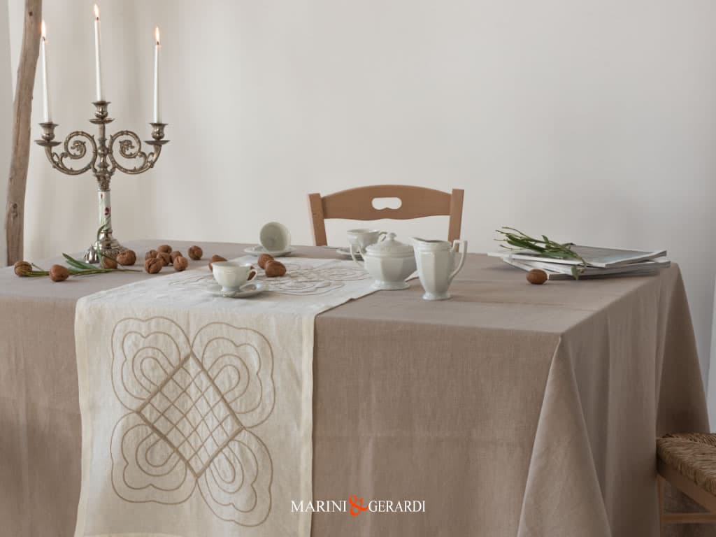 Colori: Tovaglia (Tortora | Terra Umbra); Runner (Panna con ricamo Ecrù);