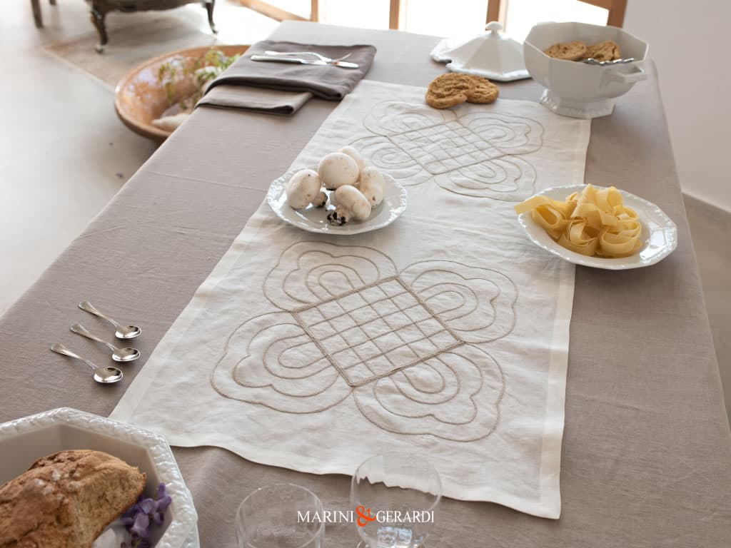 Clausura, una tovaglia runner ricamata realizzata in tessuto di puro lino è cucita sartorialmente nel nostro laboratorio al momento dell’ordine Una Grande Tovaglia, fatta come si deve per fare la differenza, perfetta e adatta per ogni occasione. Una Musa ispiratrice che può essere utilizzata in casa secondo le diverse interpretazioni.