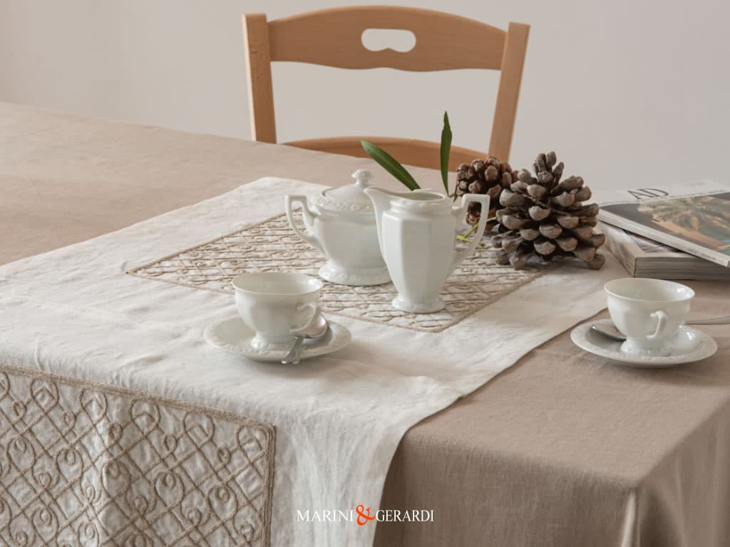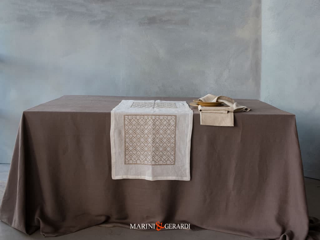 Colori: Tovaglia (Tortora | Terra Umbra); Runner (Panna con ricamo Ecrù);