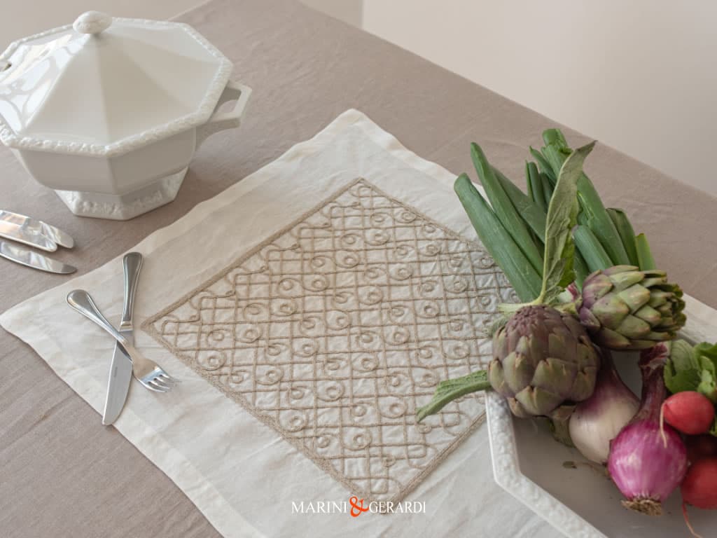 Solo i materiali di prima qualità sono impiegati in questa collezione, con una base di lino al 100% che dona un tocco “soft touch” ma pesante e corposo, trasformando la tua tavola in un’opera d’arte tessile. Prodotti disegnati e distribuiti da Marini&Gerardi, un nome che rappresenta la qualità e l’eleganza nel mondo del tessile per l’arredamento.