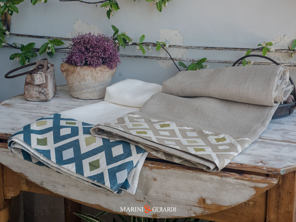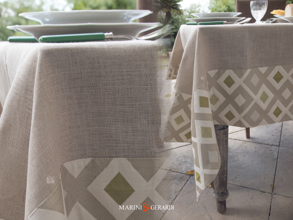 Tovaglia ispirata al vintage made in Italy dalle forme geometriche essenziali, con base disponibile in due combinazioni o sfumature di colore con bordo Déco a contrasto sovrapposto. Base in tessuto di puro lino 100% di grande pregio dal tocco corposo e delicato.