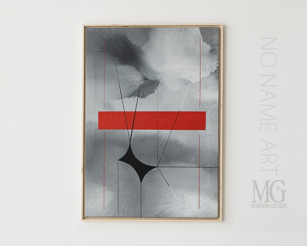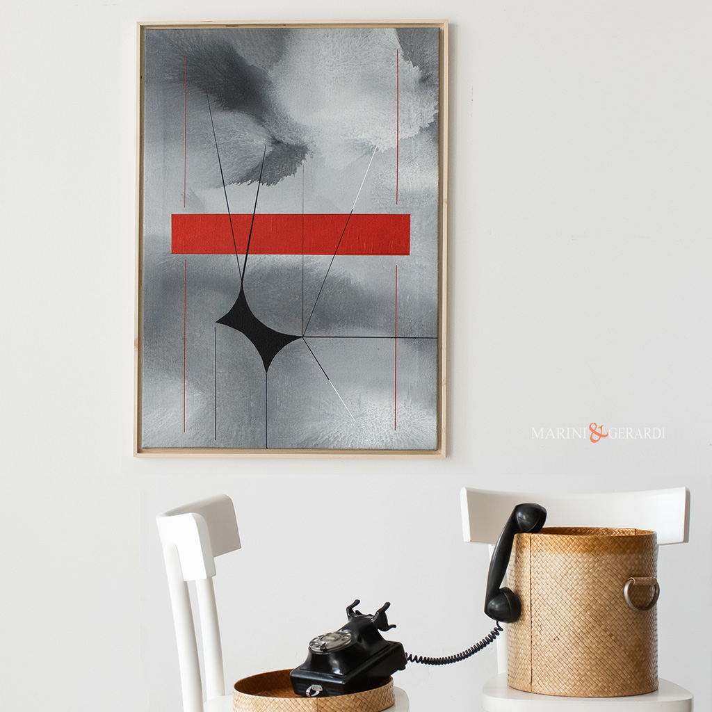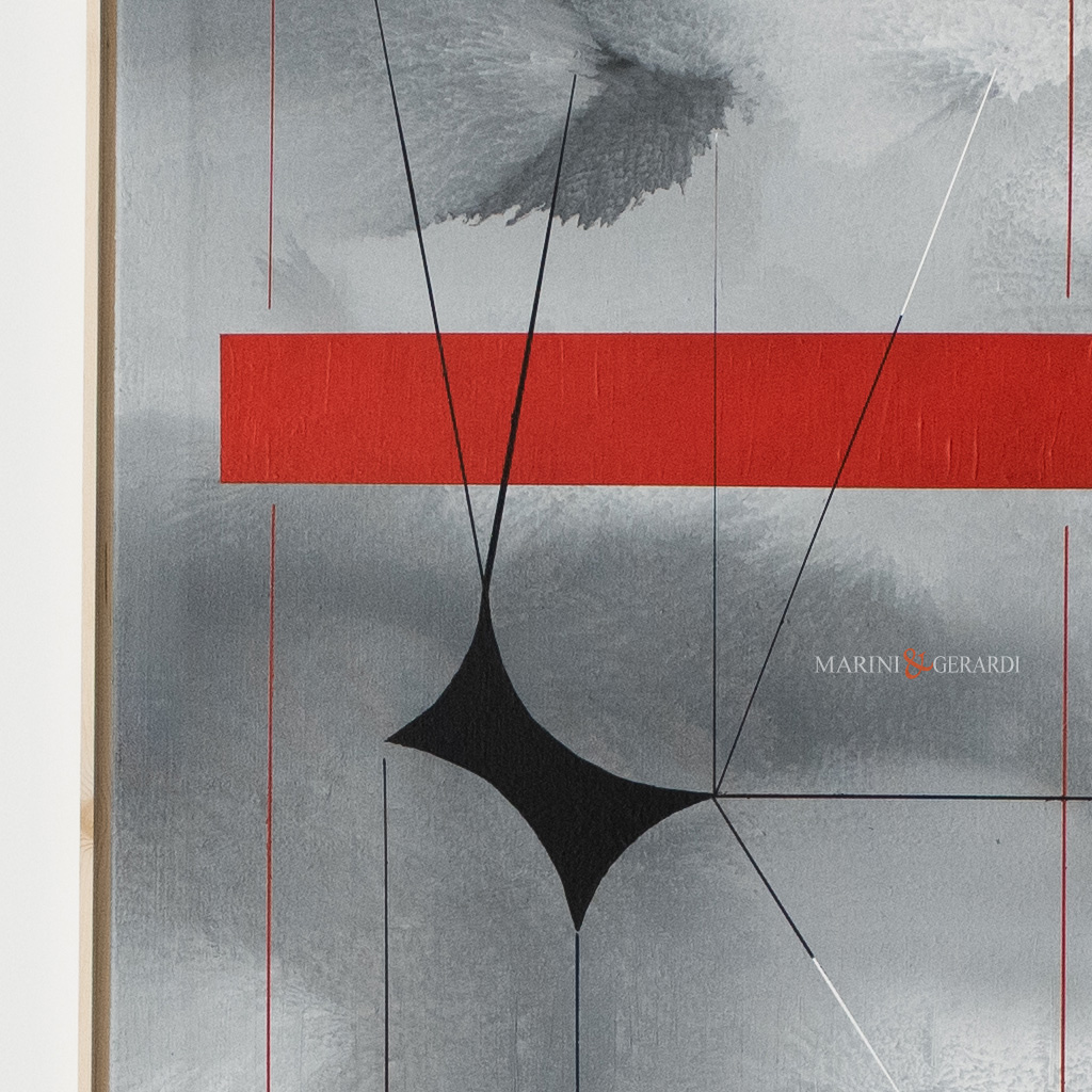 La forza visiva di questa tela risiede nella sua duplice natura. Lo sfondo è un’esplorazione della profondità, ottenuto tramite una base di colore stratificato e un ombreggio nuvoloso che conferisce all’acrilico grande serenità. È una tela che guarda all’infinito, con una figura geometrica rossa e line che interagiscono con essa.