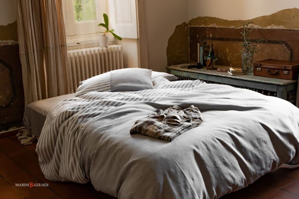 VIENNA – Set Lenzuola realizzate con tessuto in Puro Lino Indantrene che combina con grande sensibilità un rigato di tradizione, per un Set Completo Lenzuola matrimoniali che si adattino bene al vostro letto.