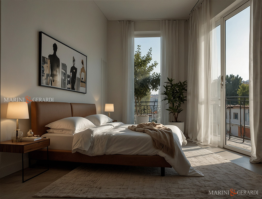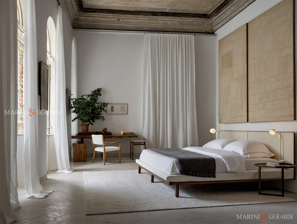 Tende di lino bianche in stanza da letto moderna