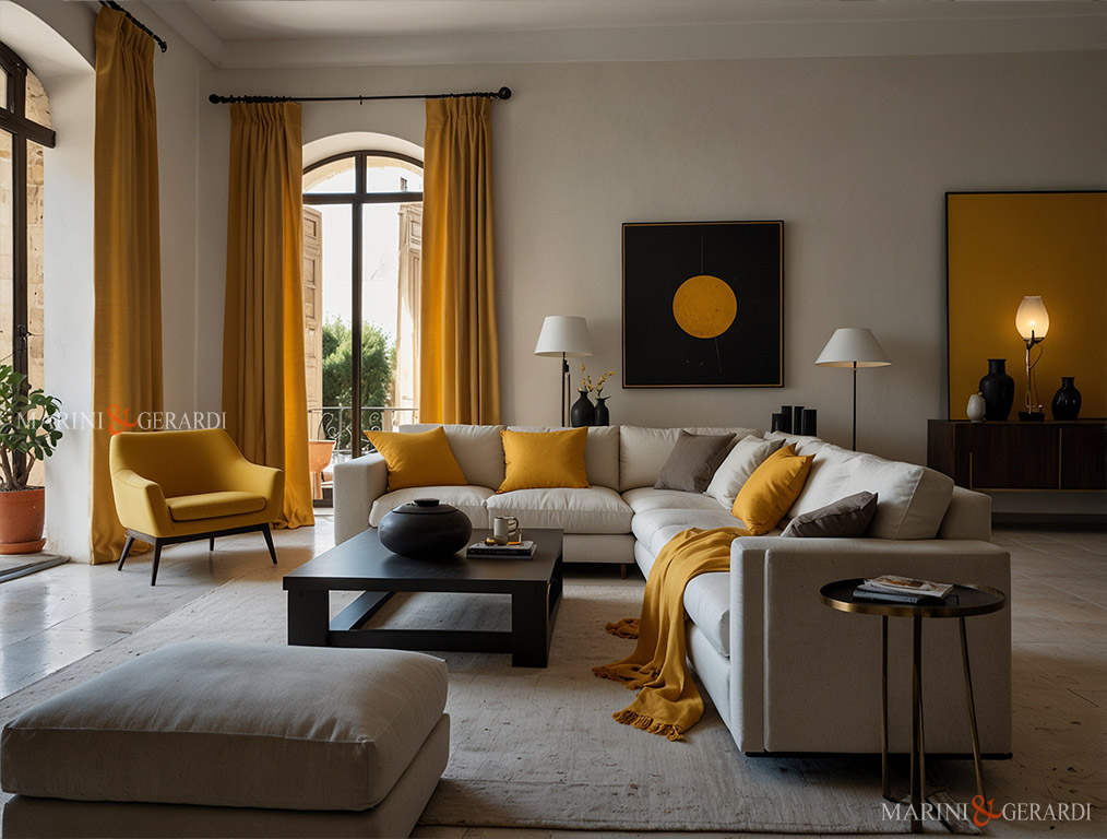 Tende di lino gialle in soggiorno moderno con sofa